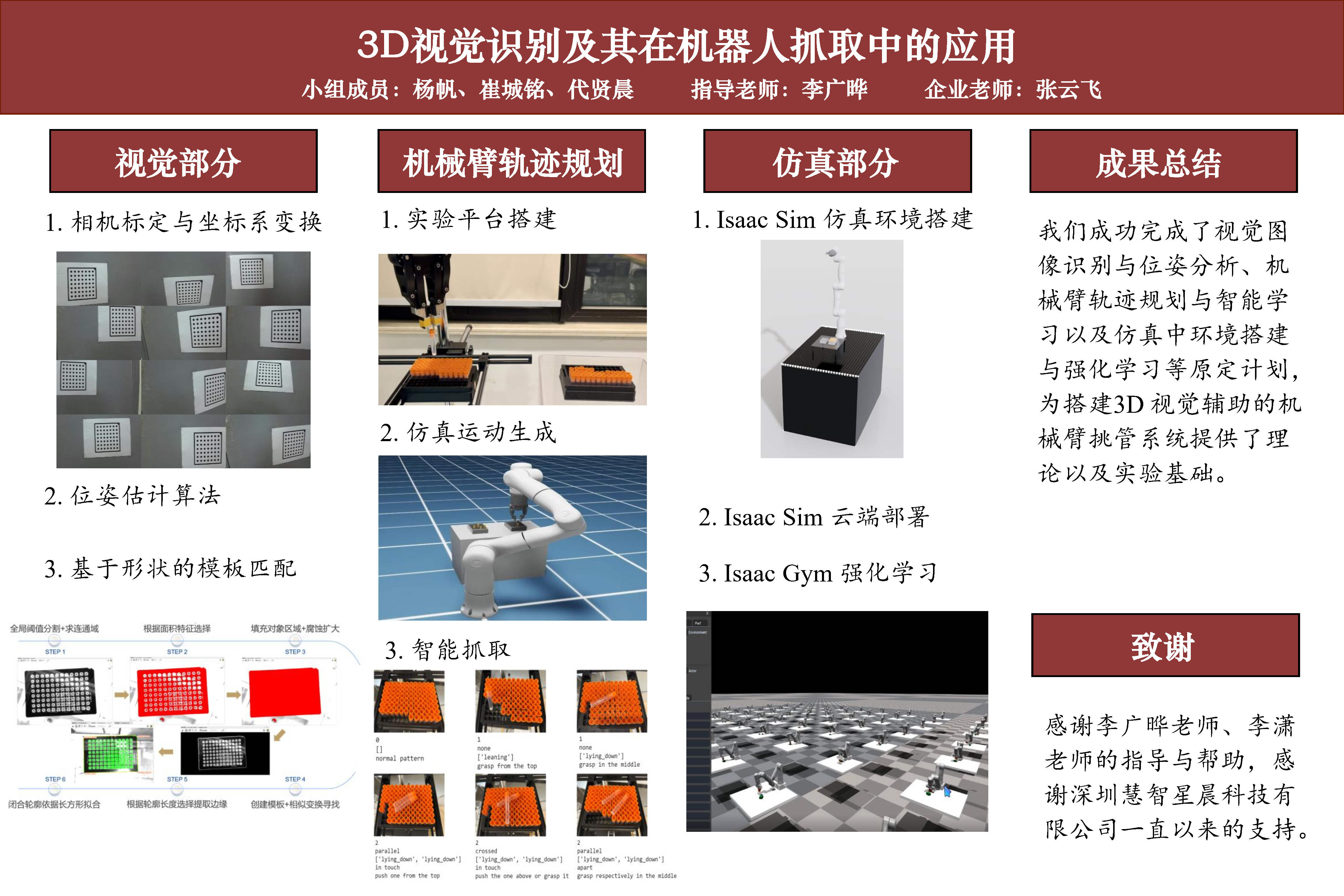 本项目针对深低温条件下挑管系统定位不精确、夹取成功率低的问题,计划将传统图像处理算法和深度学习算法结合,通过2D工业相机获取冻存盒孔位信息、深度相机获取样本管的距离信息,结合先进的图像分割与姿态估计技术,确保在异常情况下仍能准确识别和定位样本;通过基于3D视觉信息进行机械臂轨迹规划和持续学习,确保机械臂能够按照最优路径安全、高效地完成抓取和放置任务;通过搭建和优化机械臂仿真实验平台,通过强化学习的训练和仿真到现实的算法开发,提高系统的实用性和适应性。