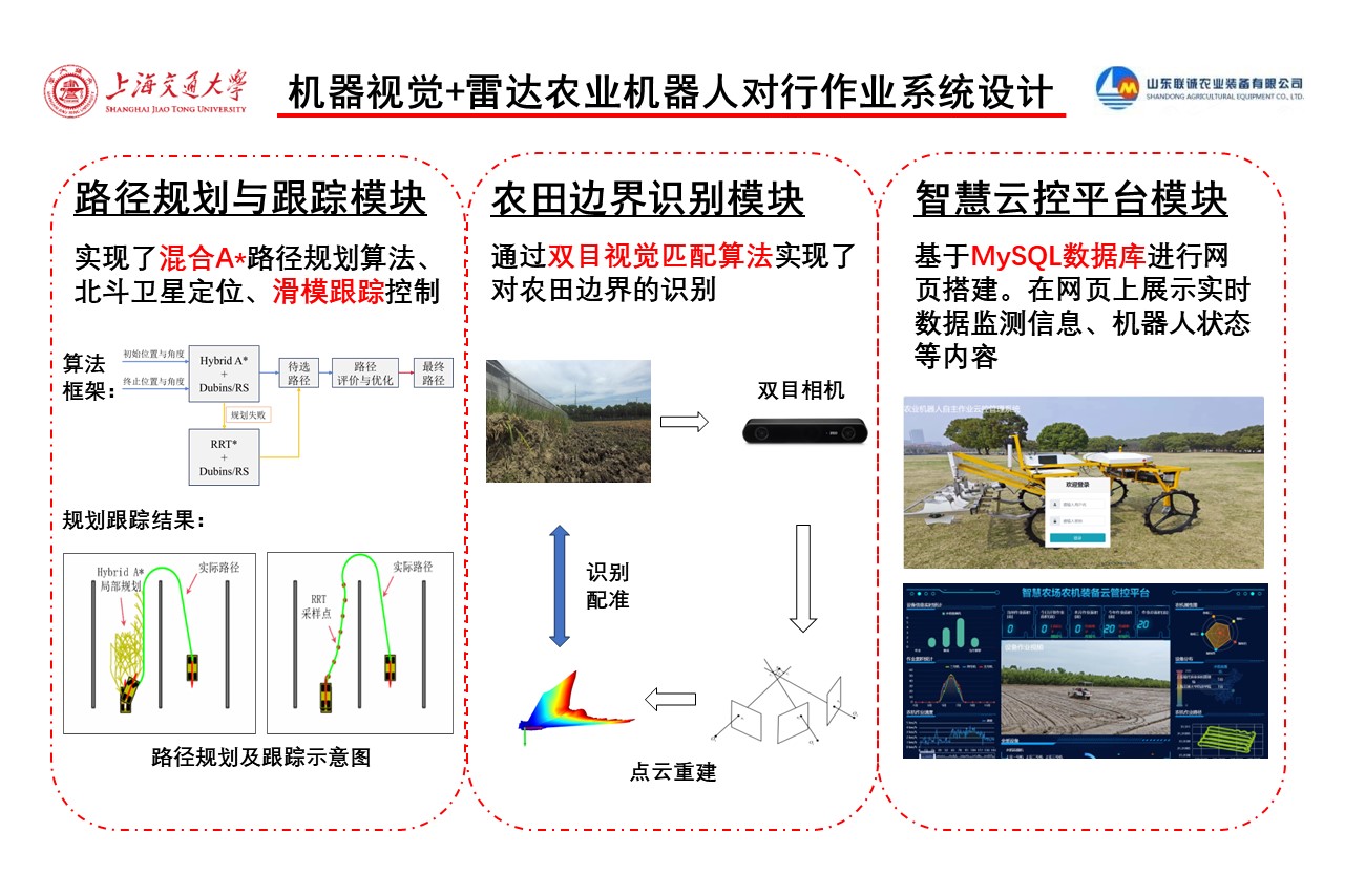 2、自主导航与作业: 通过混合A*路径规划算法和北斗卫星定位技术,实现机器人在复杂农田环境中的自主导航和精确作业,从而优化作业路径和提高作业效率。