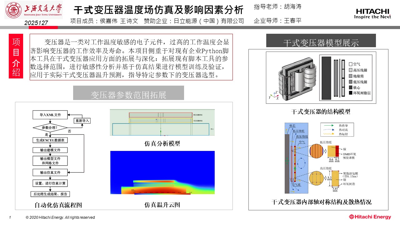 本项目侧重于对现有企业Python脚本工具在干式变压器应用方面的拓展与深化,两位同学分别负责对干式变压器温升进行敏感性分析并拓展参数选择范围、通过机器学习预测变压器温升仿真结果,最终项目实现在参数拓展范围下利用机器学习预测变压器温升从而指导选型。对于温升敏感性分析,王诗文需要完成对干式变压器气道个数、气道宽度、内外绝缘厚度以及高低压线圈绝缘部分导热系数对于温升的影响并总结规律。对于机器学习预测变压器温升,侯嘉伟需要根据企业提供的数据进行机器学习模型的建立以及重要影响变量的参数敏感性分析。