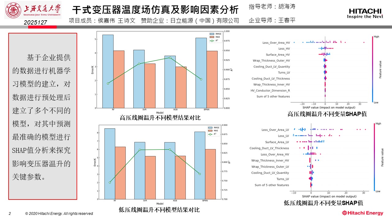 对于温升敏感性分析,王诗文已完成上述因素对于干式变压器高低压线圈平均与热点温升的影响,并总结规律。在此基础上额外探究了这些因素对于干式变压器热点系数以及变压器传热系数的影响,对于热点系数总结了不同影响因素对其影响而对于传热系数则初步总结了仿真数据,具体结论有待实验与理论探究。对于机器学习预测变压器温升,侯嘉伟根据企业提供的数据建立了多个不同的模型并进行比较,对其中预测精度最高的模型采用SHAP值分析对模型预测结果影响最大的参数,并对该参数进行具体分析。