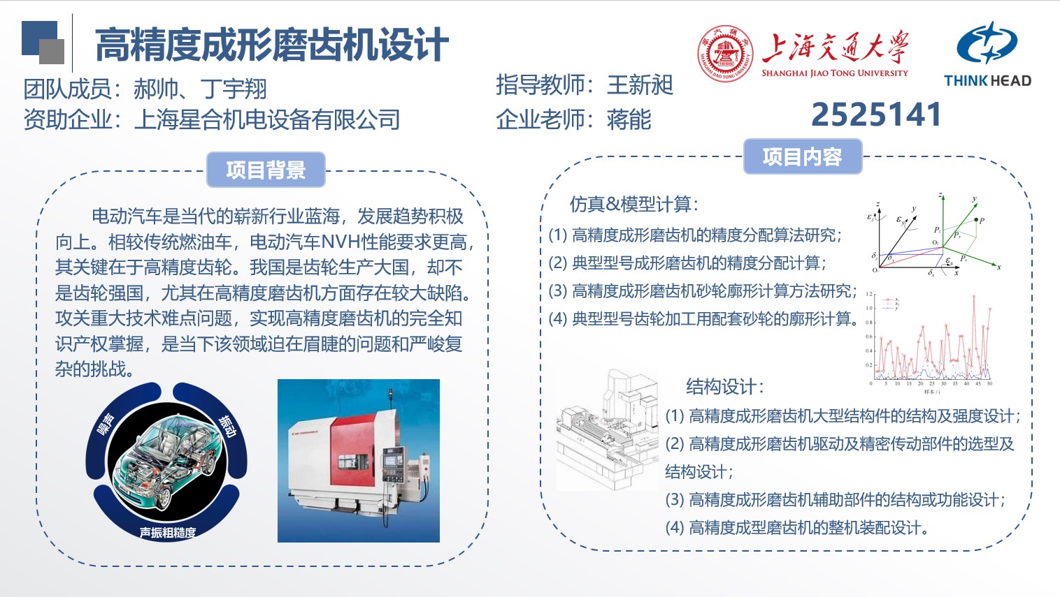 随着电动汽车产业的迅猛发展、尤其是驱动电机转速的大幅提升,对于电动汽车齿轮减速箱传动齿轮,因其与电动汽车整车的噪声、振动与声振粗糙度性能密切相关,故对精度等级要求越来越高;此外,高精度齿轮也是高端数控机床等重大装备高精度可靠运转的核心零部件。高精度齿轮精密加工最常用的工艺是成形磨削工艺,但是,国内高精度成形磨齿机严重依赖进口,国内外技术水平差距巨大。本项目旨在突破高精度成形磨齿机的关键设计方法,完成高精度成形磨齿机装备的完全自主设计。