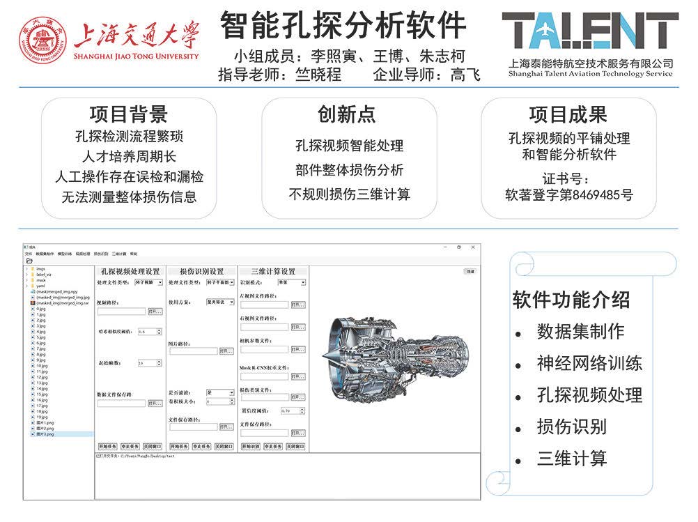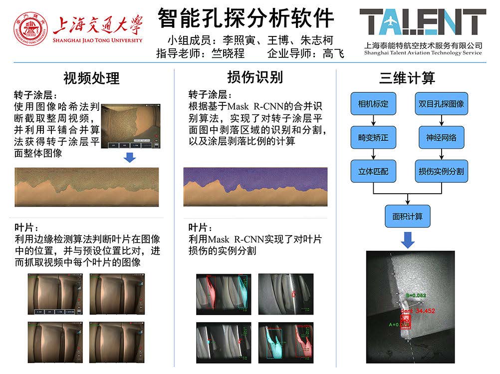 孔探检测技术广泛应用于航空发动机的检修工作,对保证飞机的飞行安全具有重要意义。但现有的孔探设备存在诸多缺陷,对专业人员依赖性强。为此,本项目利用计算机图像处理技术和神经网络方法实现对孔探图像或视频中损伤的自动化智能分析。项目预期开发一种智能孔探分析软件,通过后处理方法,获取航空发动机某一部件的整体信息。同时,利用神经网络算法实现对孔探图片和视频中损伤的进行自动识别和分类,并加入三维分析,完成对损伤的自动化定量测量。
