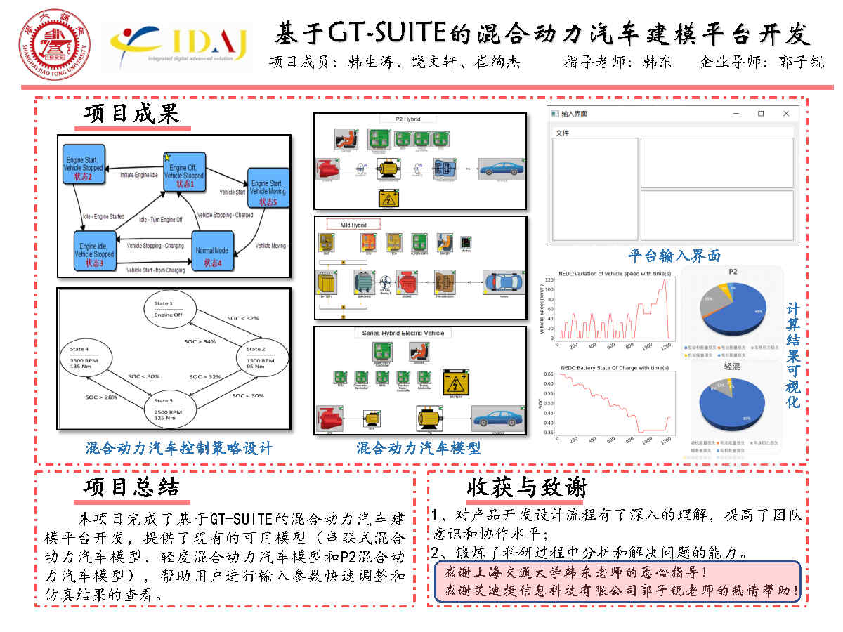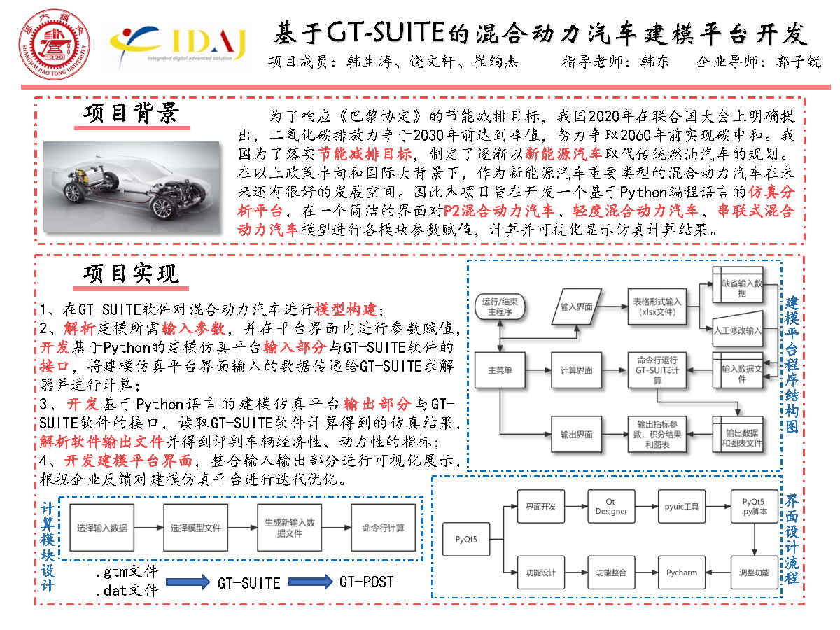 混合动力汽车是当前热门的研究课题,而用于混合动力汽车整车级建模的GT-SUITE软件操作较复杂,学习和使用的时间成本较高。为了在汽车仿真工作中简化人工操作流程,加快开发速度,本项目基于GT-SUITE模型,应用Python脚本和工具,开发了一款混合动力汽车建模平台,可以在一个简洁的界面内对串联式混合动力汽车、轻度混合动力汽车、P2架构混合动力汽车模型进行各模块参数赋值、计算并可视化显示仿真计算结果,实现了上述三类混合动力汽车模型的自动搭建和快速分析。