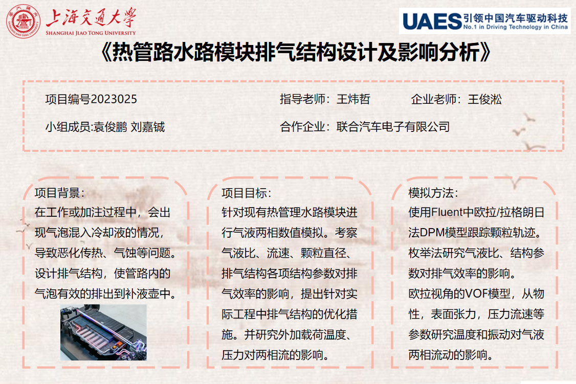 集成化是热管理重要发展的趋势。水路集成模块通过传递冷却液对电池,电机和乘客舱等部件进行换热,排气性能是其关键性能之一,在工作过程中会出现气泡融入或混入冷却液的情况,使冷却液换热效率降低,出现流阻增大等问题。因此为了能规避气泡对水路模块的影响,优化现有排气结构,能够引导气体进入到上端的含液容器结构,让尽量少的气体进入压缩机或在下个循环进入到水路模块中。此外,当温度升高、地面振动传递到管路,这些因素的影响,可能会造成气泡在正常随流过程中发生改变,需要研究外载对管内气液两相流动的影响。