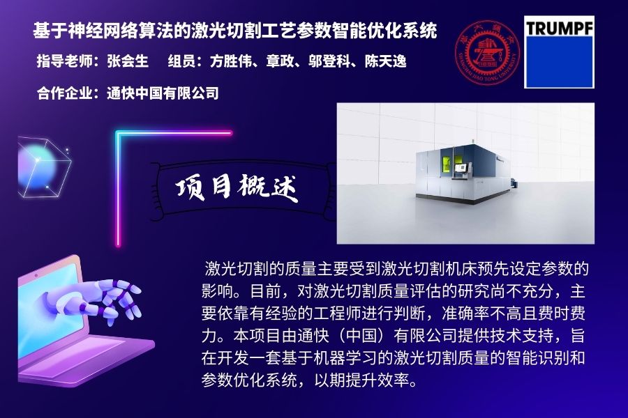 激光切割是一种被广泛应用的切割工艺,具有变形小、效率高和无接触切割等优点,在汽车、轮船、航空航天等多个领域有广泛的应用。激光切割的质量主要受到激光切割机床预先设定参数的影响。目前,对激光切割质量评估的研究尚不充分,主要依靠有经验的工程师进行判断,准确率不高且费时费力。本项目由通快(中国)有限公司提供技术支持,旨在开发一套基于机器学习的激光切割质量的智能识别和参数优化系统,以期提升效率。
