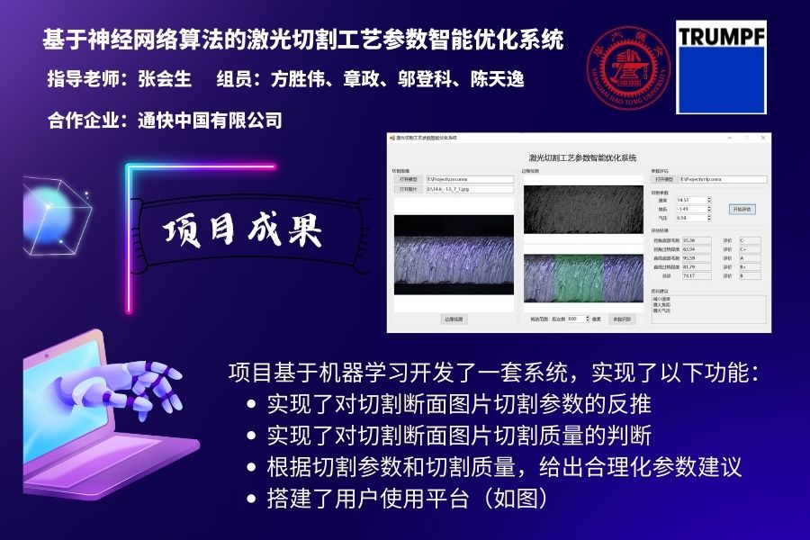 提取激光切割断面图中的各种特征,利用机器学习实现对切割参数的反推并实现对切割断面准确的质量评价;利用反推出的切割参数和质量评价结合相关经验给出合理化参数修改建议;将模型泛化使其能够适用于不同材料不同厚度的样本;开放客户使用平台提供系统给用户使用,用户上传切割断面图片,系统输出切割参数并对切割质量进行评价,同时给出合理化的参数优化建议。