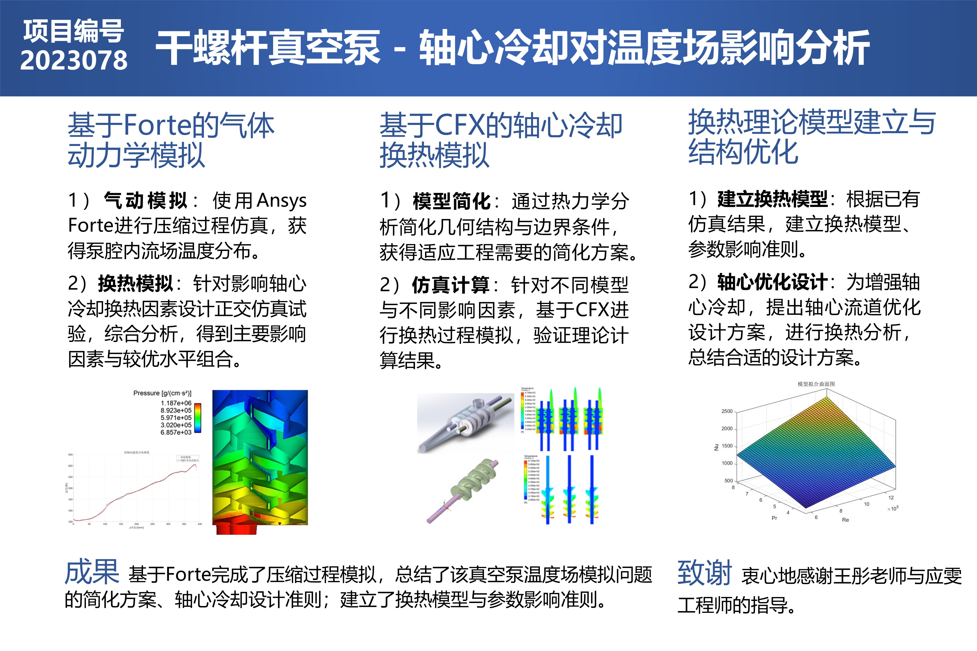 本项目主要使用CFX和Forte两种CFD软件对英格索兰提供的干式螺杆真空泵泵头内部温度场细部的变化情况进行数值研究,分别通过对压缩过程和换热过程的仿真,得到流动与温度的变化特性,并通过改变相应参数(冷却介质种类,入口温度、流量,轴心管径等)观察分析对冷却效果的影响。同时对该模型进行了理论上的换热分析,并基于仿真结果建立了干式螺杆真空泵轴心冷却方案的设计指导准则以及新的换热模型,并基于理论对轴心流道进行了优化设计。