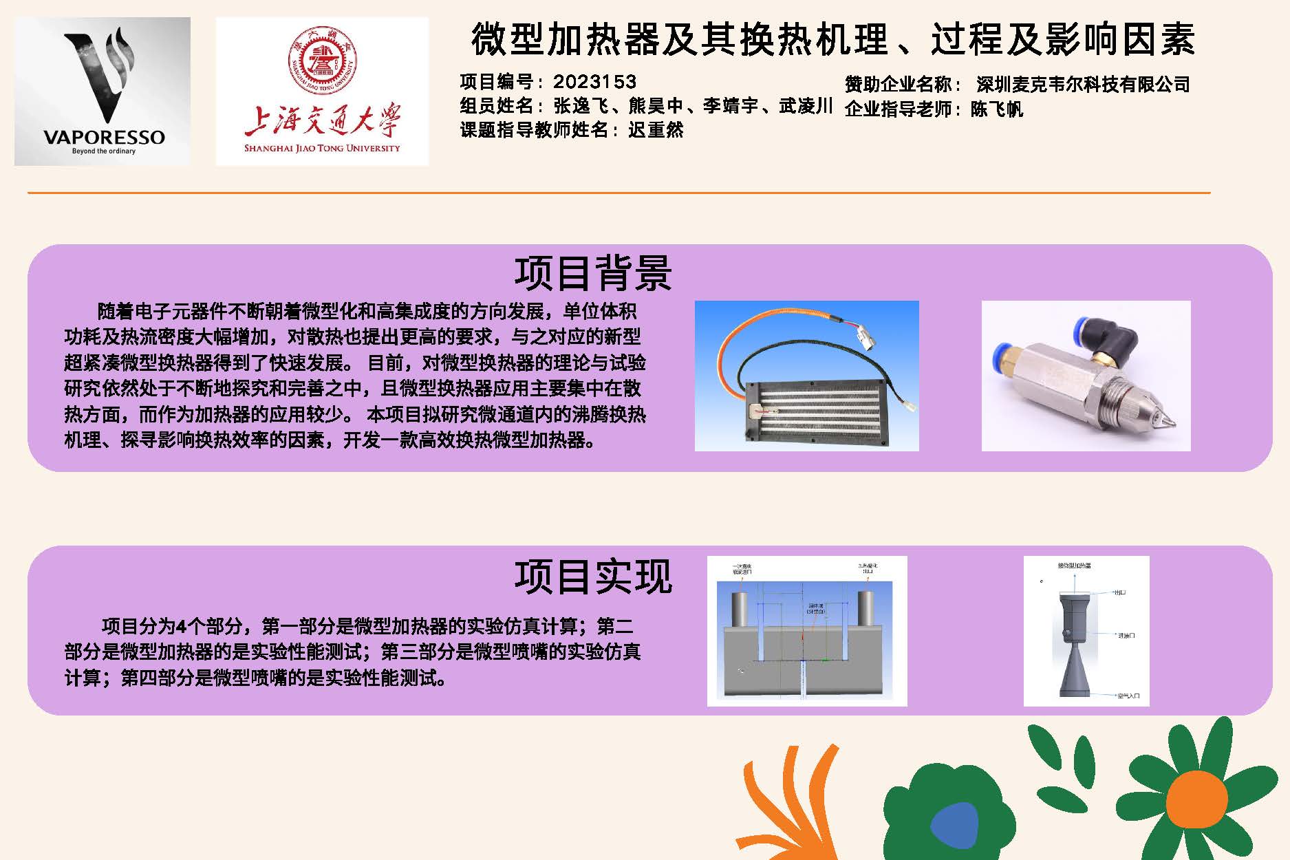 随着电子元器件不断朝着微型化和高集成度的方向发展,单位体积功耗及热流密度大幅增加,对传热性能也提出更高的要求,与之对应的新型超紧凑微型换热器得到了快速发展。目前对微型换热器的理论与试验研究依然处于不断地探究和完善之中,且微型换热器应用主要集中在散热方面,而作为加热器/雾化器的应用较少。,本项目拟研究微喷嘴-微通道系统的雾化与相变机理,探寻影响加热效率与雾化蒸发效果的因素,尝试开发一款满足企业各项需求的高效微型加热器,并追求其商用价值。