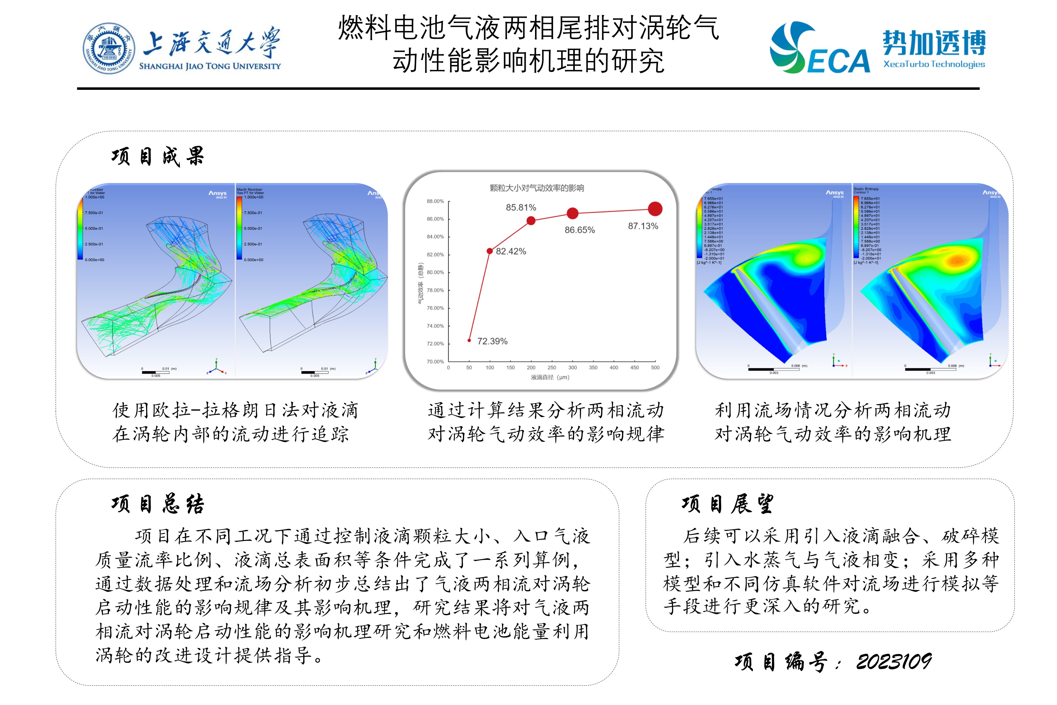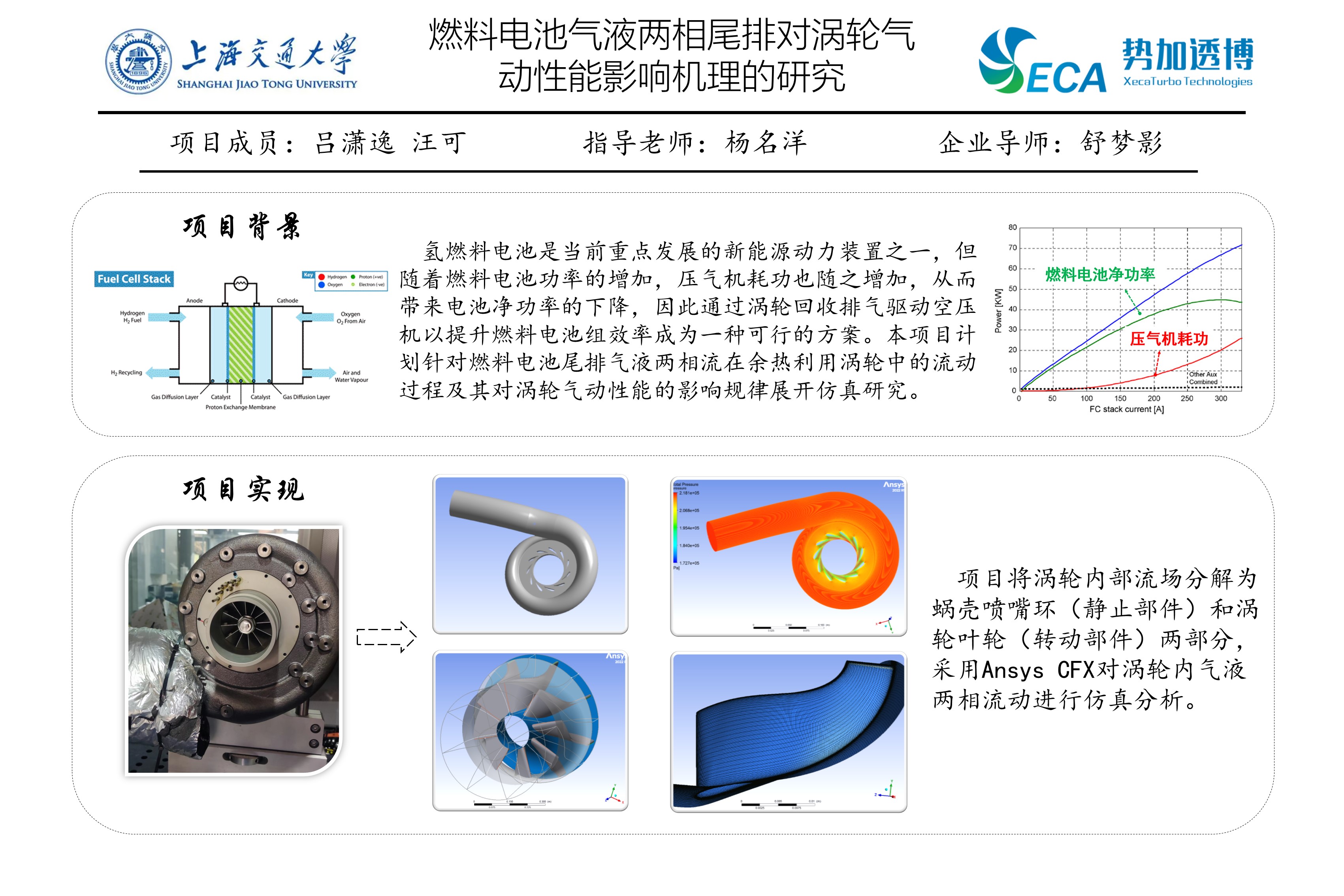 为了实现双碳目标,在交通运输领域,氢能源燃料电池成为当前着重发展的新能源技术。出于功率提升的需要,燃料电池堆进气部分需要压气机对空气进行加压。随着燃料电池堆总功率需求的增加,压气机耗功也随之增加,将导致净功率上升缓慢甚至下降。因此,计划通过涡轮对燃料电池尾气进行回收,驱动压气机,从而提升系统净效率。由于目前国内外研究有关径流涡轮内部两相流动仿真研究的缺失,本项目计划针对燃料电池尾排中的气液两相流对径流涡轮内部流场的影响规律以及影响机理展开仿真研究。
