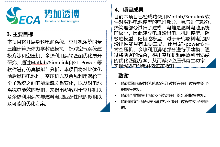 本项目将开展燃料电池系统、空压机系统的全三维计算流体力学数值模拟,针对空气系统建模方法和空压机、余热利用涡轮匹配优化展开研究,通过Matlab/Simulink和GT-Power 等软件进行仿真模拟与分析。本项目将对比优化前后燃料电池堆、空压机以及余热利用涡轮三个子系统之间的能量流关系变化,以及对电池系统总能效的影响,来得出参数对于空压机以及余热利用涡轮与燃料电池匹配性能的影响以及可能的优化方案。
