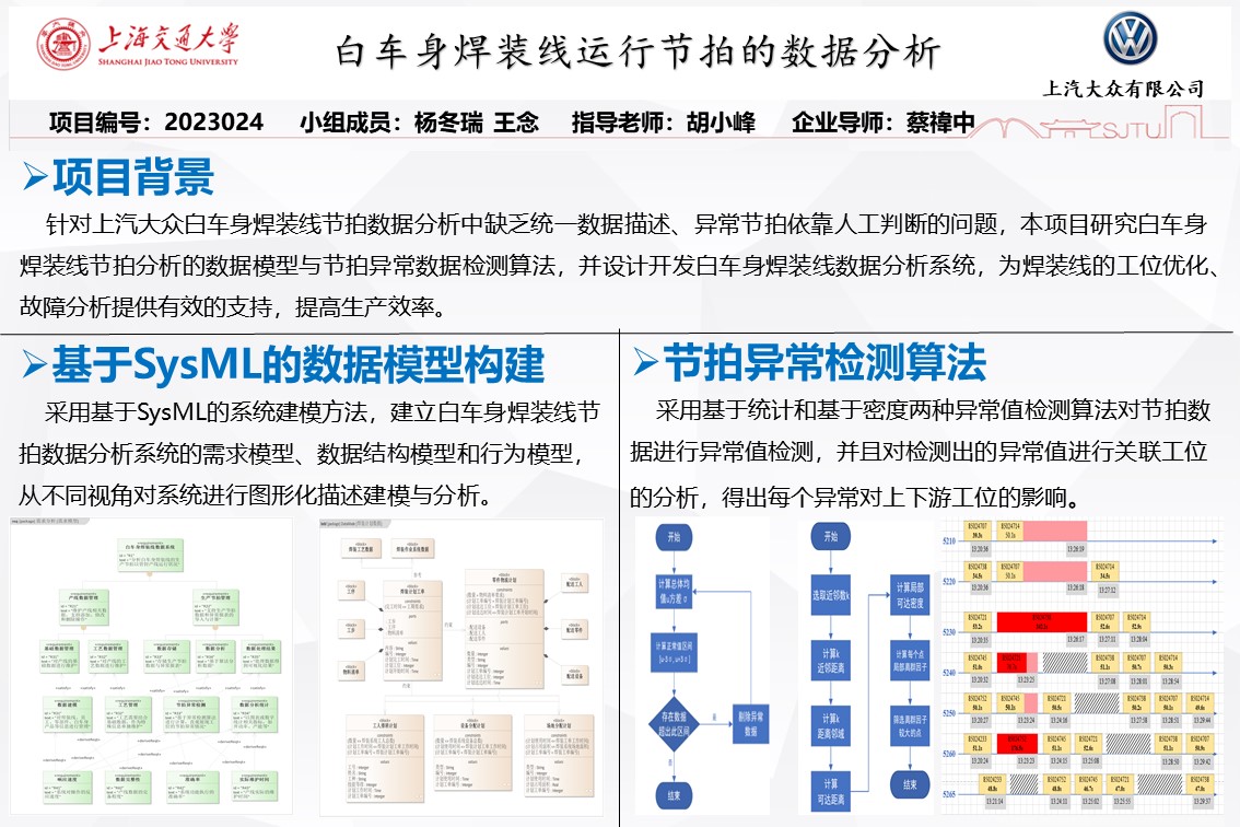 本项目通过对SysML建模方法与异常数据检测算法的研究,设计开发白车身焊装线数据系统,实现对生产节拍信息的合理分析,从而支持生产线运行过程的管理决策。