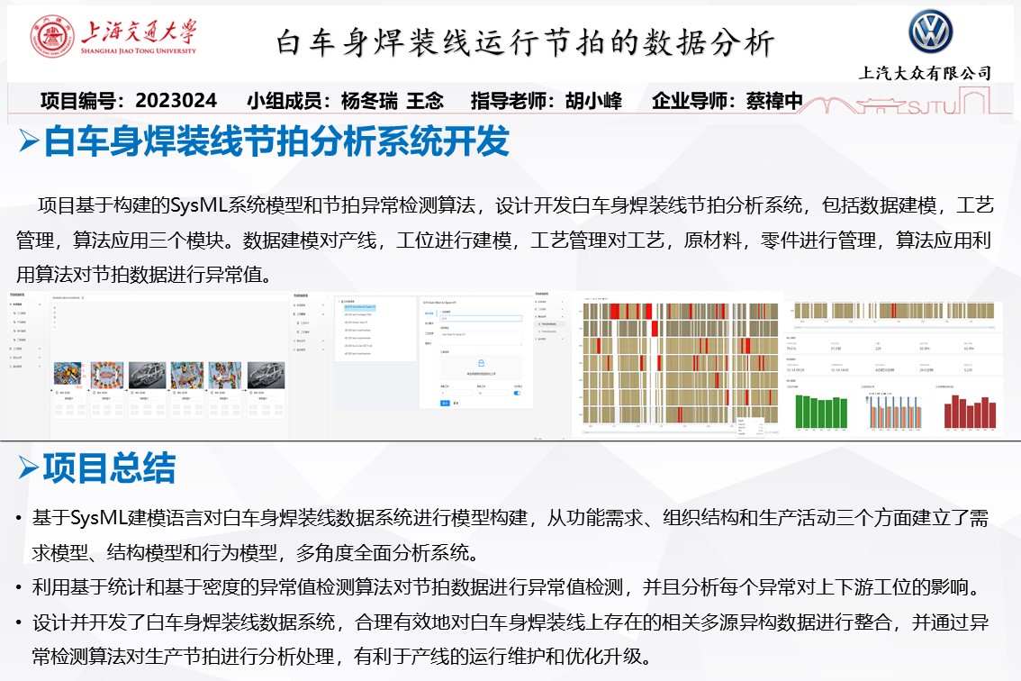 • 设计面向白车身焊装线的数据分析系统,实现对焊装线节拍数据的记录和自动异常检测,并在实际装配过程中进行测试验证。