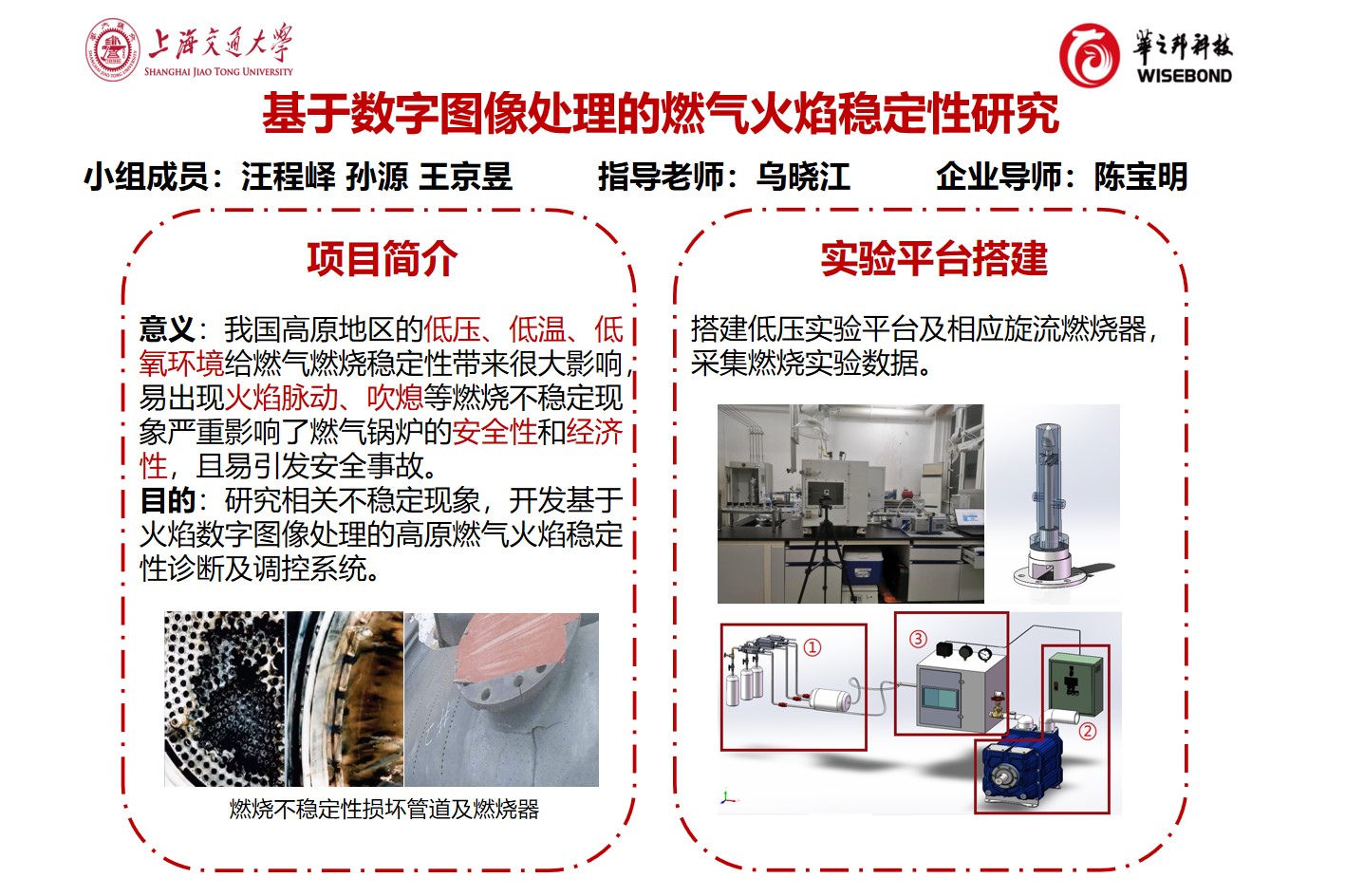 我国西部地区(如青海、西藏等地),由于海拔较高(平均海拔高于4000米)导致的低压、低温、低氧环境给燃气燃烧稳定性带来很大挑战,易出现诸如火焰脉动、吹熄等燃烧不稳定现象,给我国高原地区燃气锅炉的安全、稳定运行带来较大隐患。为此,本项目以低气压条件下的燃气火焰为研究对象,通过实验研究了钝体形状、旋流数、压强对火焰稳定性的影响,搭建了燃气火焰稳定性调控系统,为指导高原地区燃气燃烧器的安全运行提供参考。