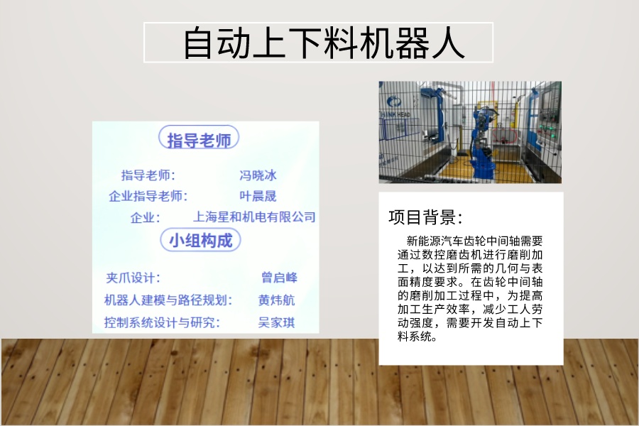 本项目设计一套自动上下料系统以实现新能源汽车齿轮中间轴高精度磨削自动化加工流程。该系统由磨齿机、工业机器人及其控制器、夹爪设备、上下料盘设备、清洗设备、车间安全设备和电器柜组成。自动上下料系统能够实现快速、大批量加工,节省人力成本,提高生产效率,并降低工人劳动强度。它具有高效率、高稳定性、结构简单易于维护、适应不同产品的生产等优点。
