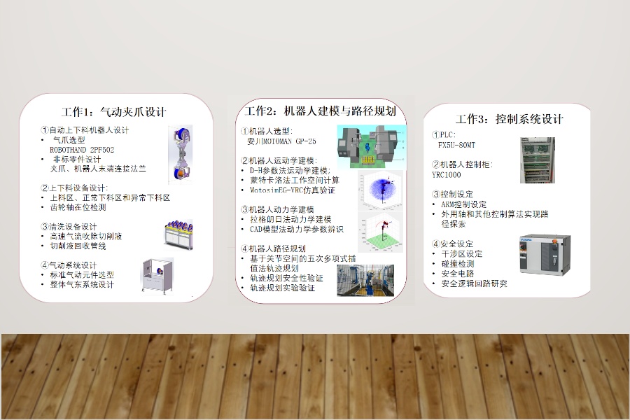 气动夹爪方面,完成了气爪设计和实物装配,并且能够按照预期运行,符合项目需求。此外,完成机器人自动上下料机器人系统的其他设备的设计于安装,包含:上下料盘设备、清洗设备和其他防护设备。机器人建模与路径规划方面,完成了如下内容:(1)自动上下料关节机器人的选型,选用了安川MOTOMAN GP-25六轴机械臂,(2)完成了基于D-H参数法的运动学建模机器人,进行了基于蒙特卡洛法的工作空间计算,(3)在CAD模型法动力学参数辨识上,基于拉格朗日法完成了动力学建模,(4)实现基于关节空间的五次多项式插值法轨迹规划,并进行了路径规划安全性验证和实际运行测试。在控制系统设计方面完成了如下内容:(1)PLC选型,采用FX5U-80MT,(2)机器人控制柜选型,采用YRC1000,(3)控制设定,采用ARM控制设定,并且探讨外用轴和其他控制算法实现路径,(4)符合车间安全规范的设定,如:干涉区设定、碰撞检测、安全电路和安全逻辑回路研究。