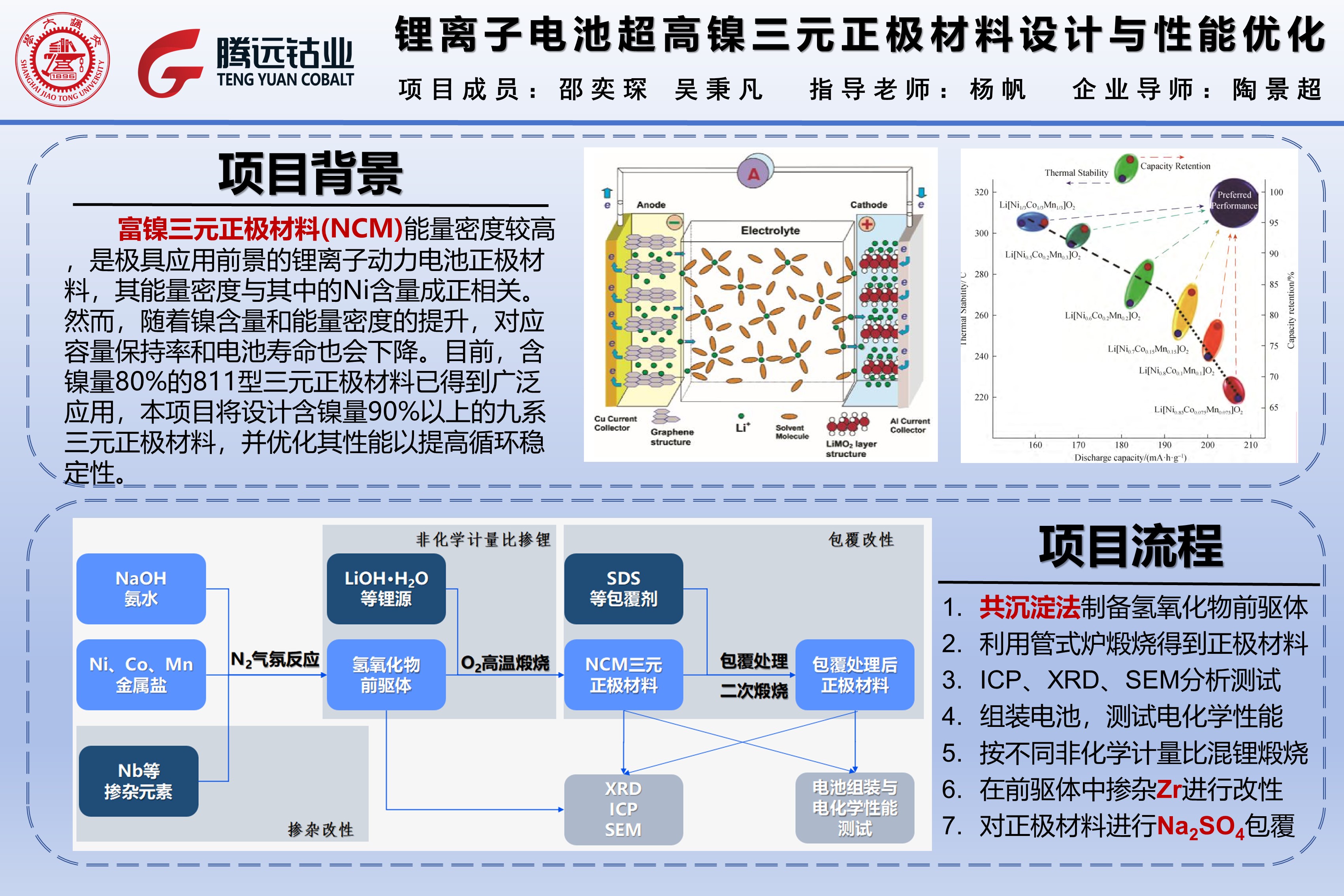 本项目在广泛商用的含镍80%的811型正极材料的基础上,设计制备了含镍90%以上的九系三元正极材料,进行了性能表征,并通过掺杂、包覆等方法进行了性能优化。