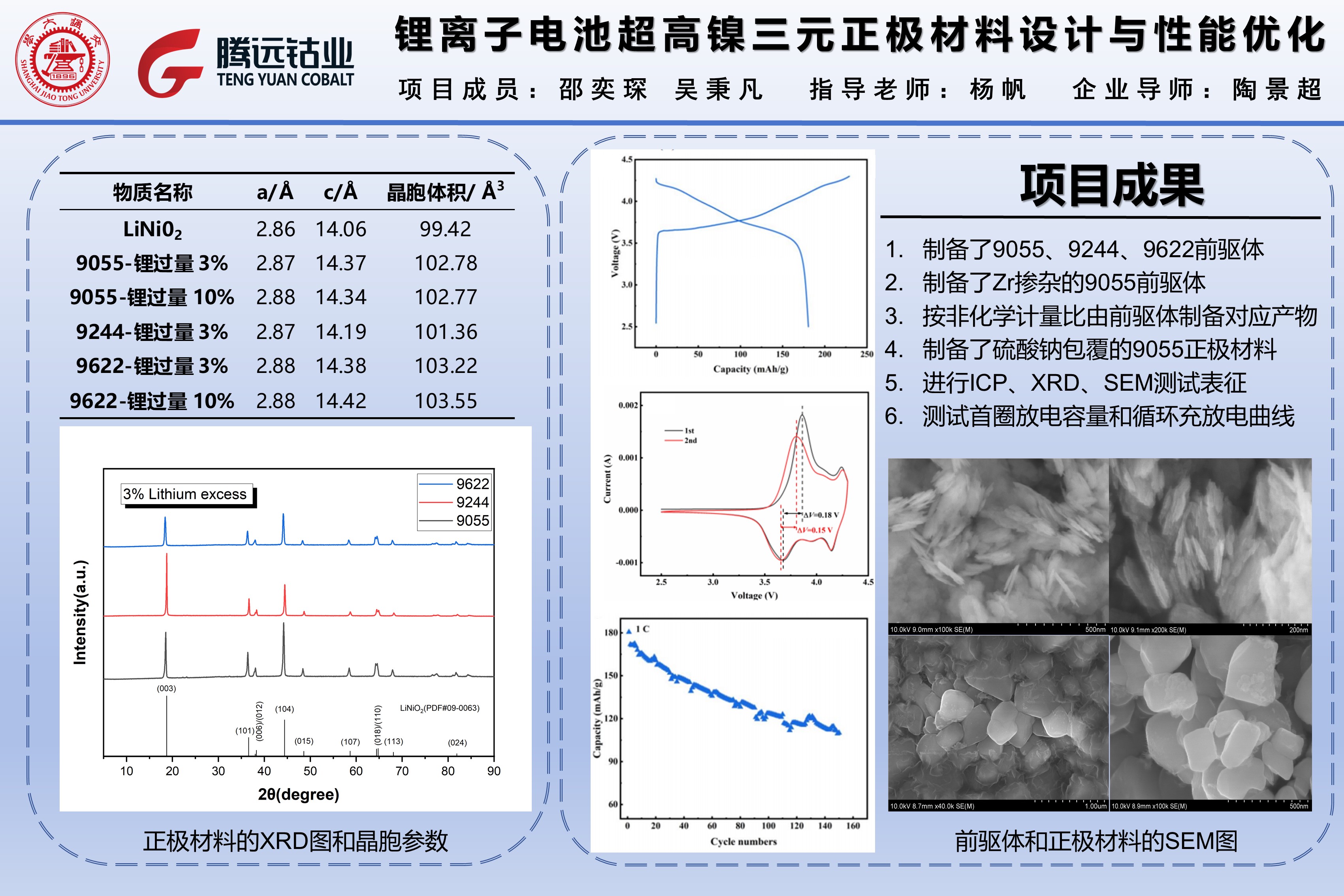 3. 通过组装纽扣电池完成了正极材料的电化学测试,得到首圈放电容量、循环充放电曲线等数据,定量计算出对应正极材料的能量密度和容量保持率;