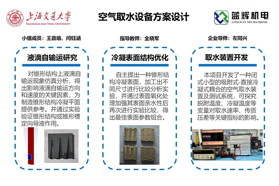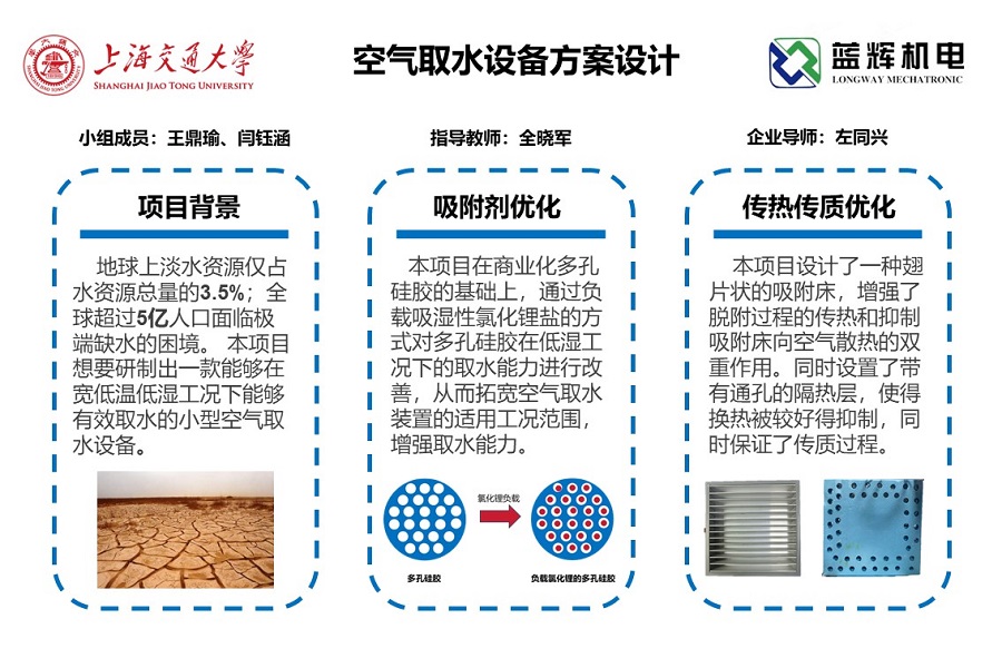 本项目立足于全球淡水资源匮乏的现实背景,基于空气取水技术的发展,特别关注于吸附式空气取水技术的发展以及高效冷凝技术的进步,比如吸湿性吸附剂的种类以及特性、冷凝面微结构的调控优化等,本项目采用吸附式-直接冷凝耦合的空气取水方法。与目前常用的空气取水方法相比,通过吸附剂的吸附-脱附过程富集空气中的水蒸气,和冷凝表面微结构的创新设计以及表面理化性质调控冷凝过程的高效进行,拓宽了空气取水设备的适用工况范围,给实际取水设备的设计提供一定的参考。