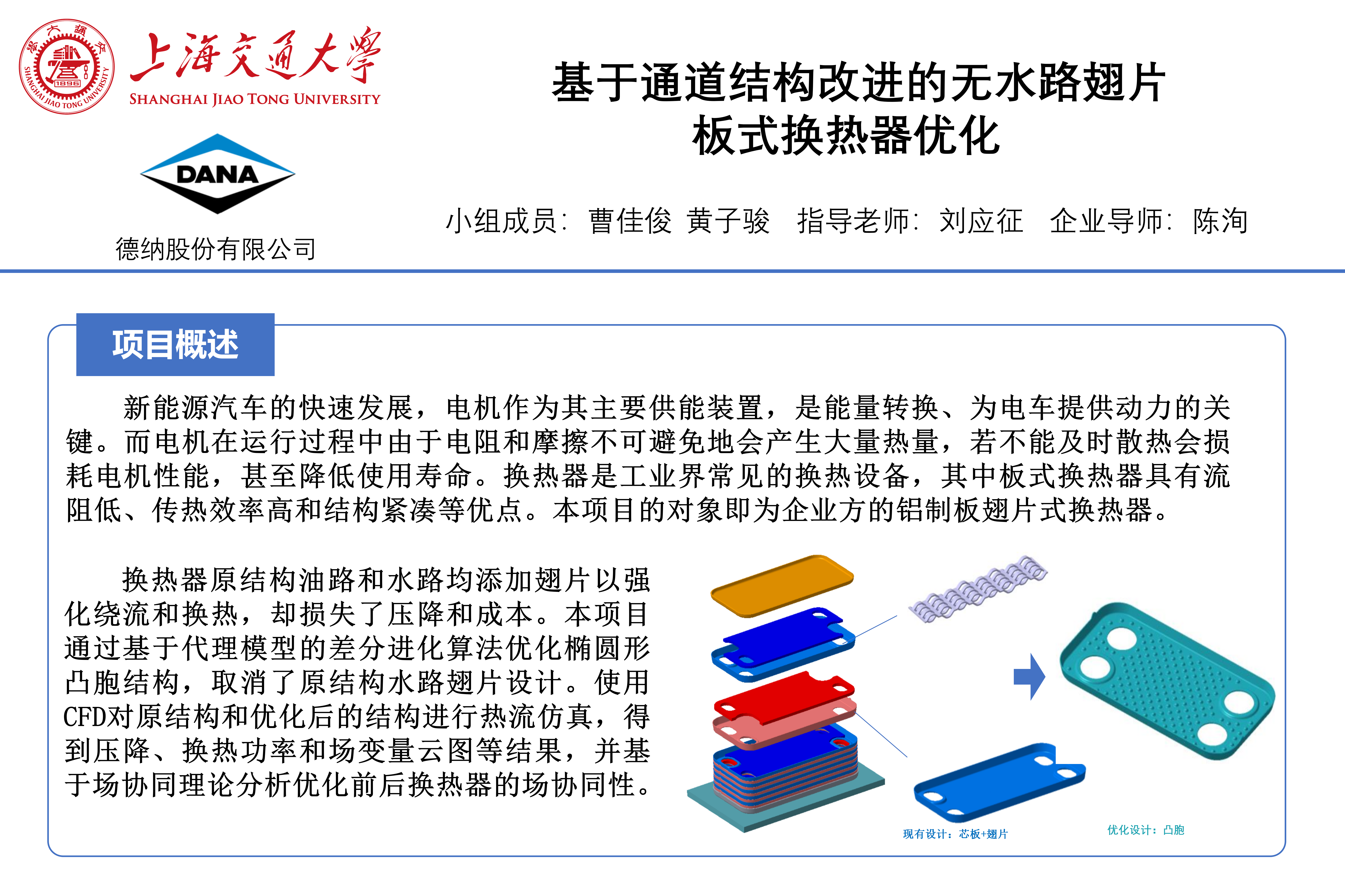 本项目的对象为企业方用于冷却汽车电机的铝制板翅片式换热器。换热器原结构油路和水路中均添加翅片以强化绕流和换热,却损失了压降和成本。本项目基于人工神经网络构建代理模型,使用差分进化算法优化椭圆形凸胞结构,取消了原结构水路翅片设计。使用Fluent软件对原结构和优化后的结构进行热流仿真,建立与实验结果符合的仿真范式,输出压降、换热功率和场变量云图等结果,并基于场协同理论分析优化前后换热器局部和整体的场协同性。