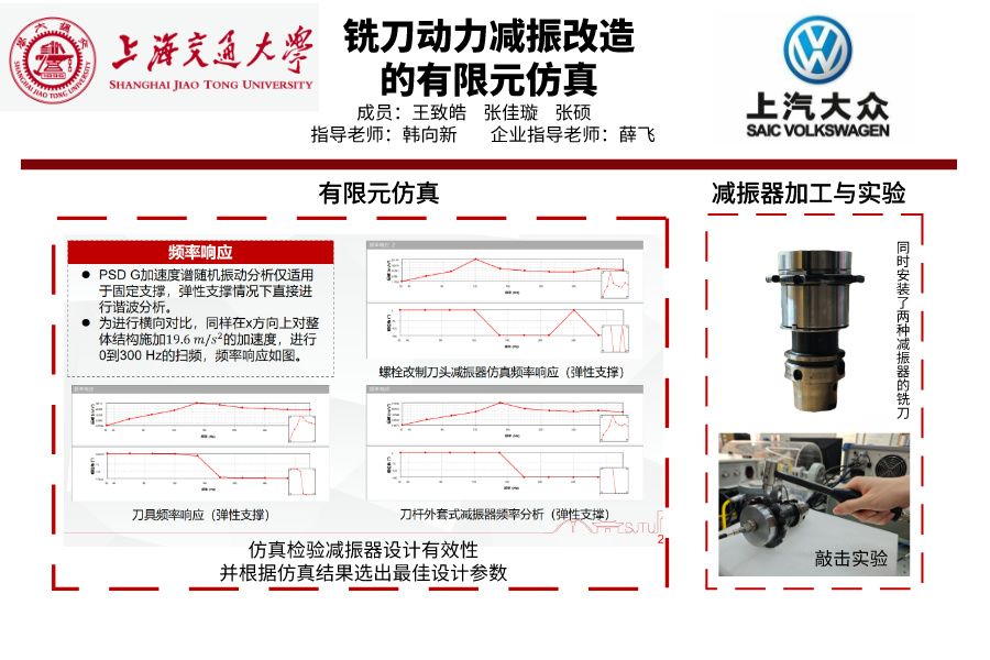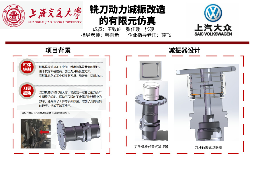 缸体是发动机加工中加工难度与体量最大的零件,材料硬度高,加工刀具所受应力大,在缸体铣削加工中有多款刀具,悬臂长、切削力大,当刀具的长径比较大时,若受到一定的切削力会产生明显的振动。振动不仅限制了金属切削过程中的效率,还降低了工件的表面质量,增加了刀具磨损的速率,造成了加工噪声。因此,金属切削过程中避免和抑制振动非常重要,这也是大众公司设立课题进行研究的目的。为降低振动对铣削加工的影响,本课题通过设计加装在铣刀上的动力减振装置,改善铣刀加工过程中的动力结构,从而实现系统性有效减振。项目首先通过Ansys和Abaqus两种软件进行有限元仿真,设计适应安装在刀杆上的动力减振器。通过对比选择最佳的减振器设计方案加工出实体模型进行性能测试。预期实现减小切削振动最优效果,降低噪音,提升刀具寿命,降低生产成本。