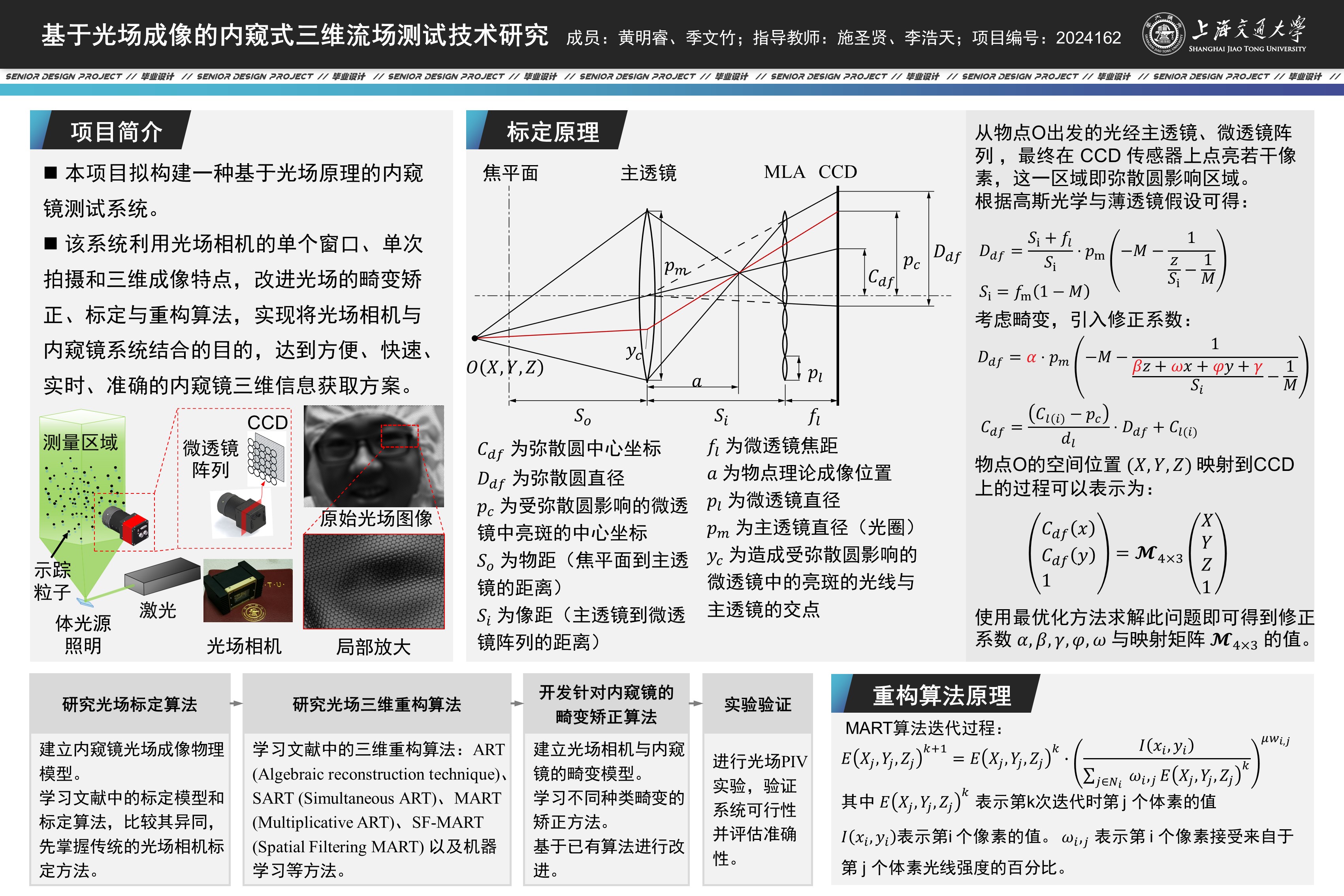 本项目旨在开发一套先进的内窥光场成像系统,以高分辨率光场相机和内窥镜为核心。项目首先基于现有硬件系统和高斯光学成像原理,深入研究和优化内窥光场的标定和三维重构算法。通过实验室现有光学测量设备,学习现有标定模型和内窥光场成像原理,搭建内窥光场成像系统并获取实验数据。进一步开发和调整图像处理算法,包括光场标定和三维重构用于处理和优化实验数据。最后,在实现以上算法的基础上,进行PIV实验,获取并计算光场成像三维信息。
