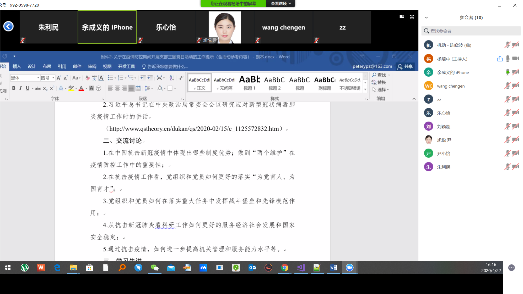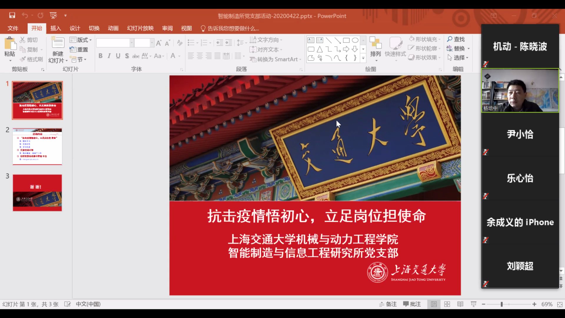 4月22日,智能制造与信息工程研究所党支部线上开展“抗击疫情悟初心,立足岗位担使命”的主题党日活动,活动由支部书记杨培中主持。