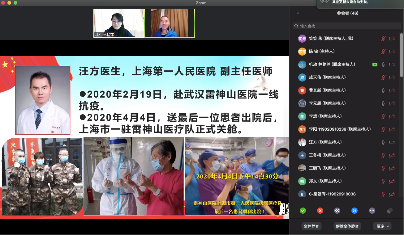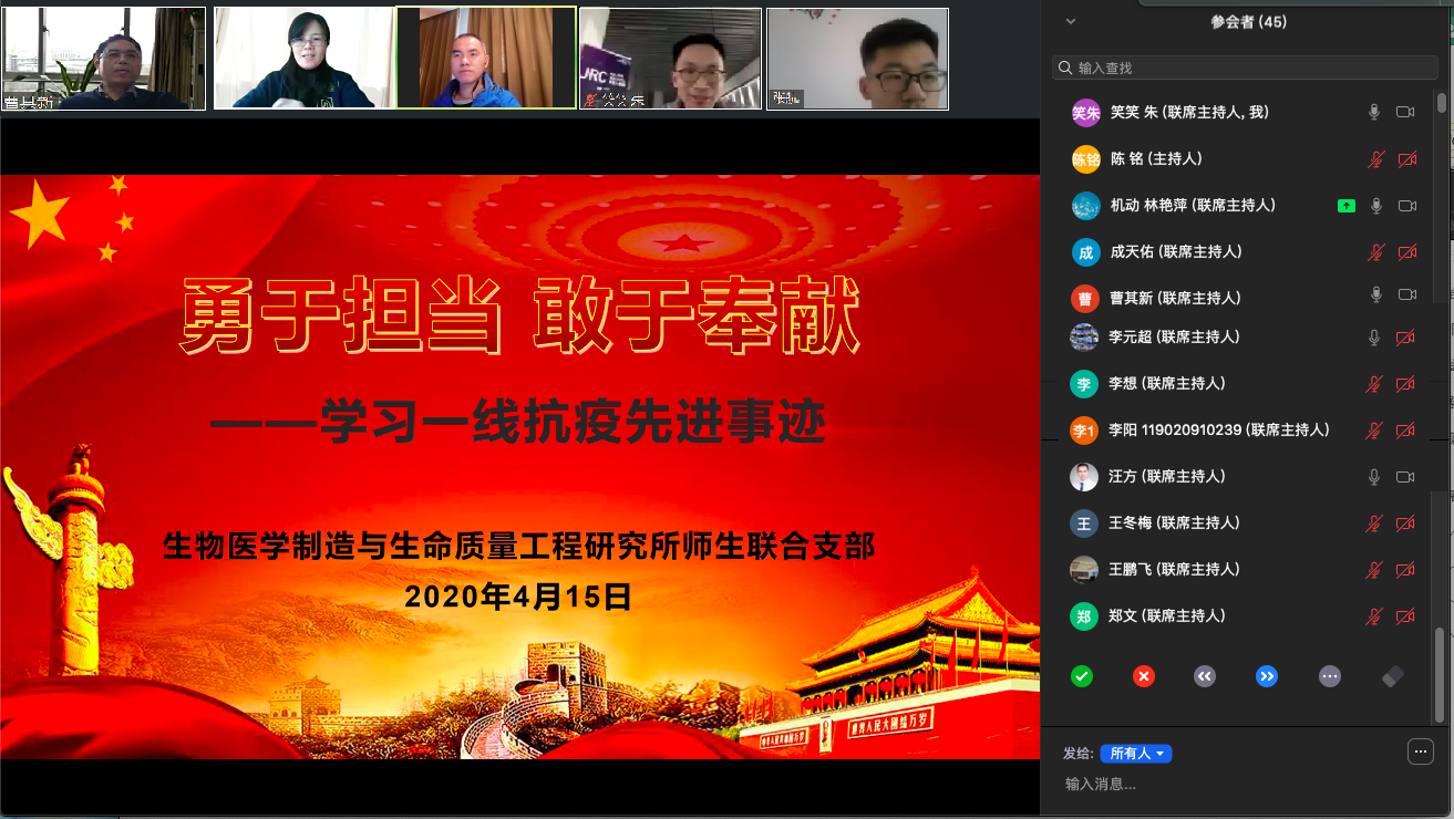 4月15日,生物医学制造与生命质量工程研究所党教工党支部联合学生党支部,线上开展“勇于担当 敢于奉献——学习一线抗疫先进事迹”的主题党日活动,邀请365英国上市公司官网医学院附属第一人民医院汪方副主任医师分享他在武汉雷神山医院一线抗疫的事迹和感受。研究所全体师生党员、部分非党员师生参加了活动。