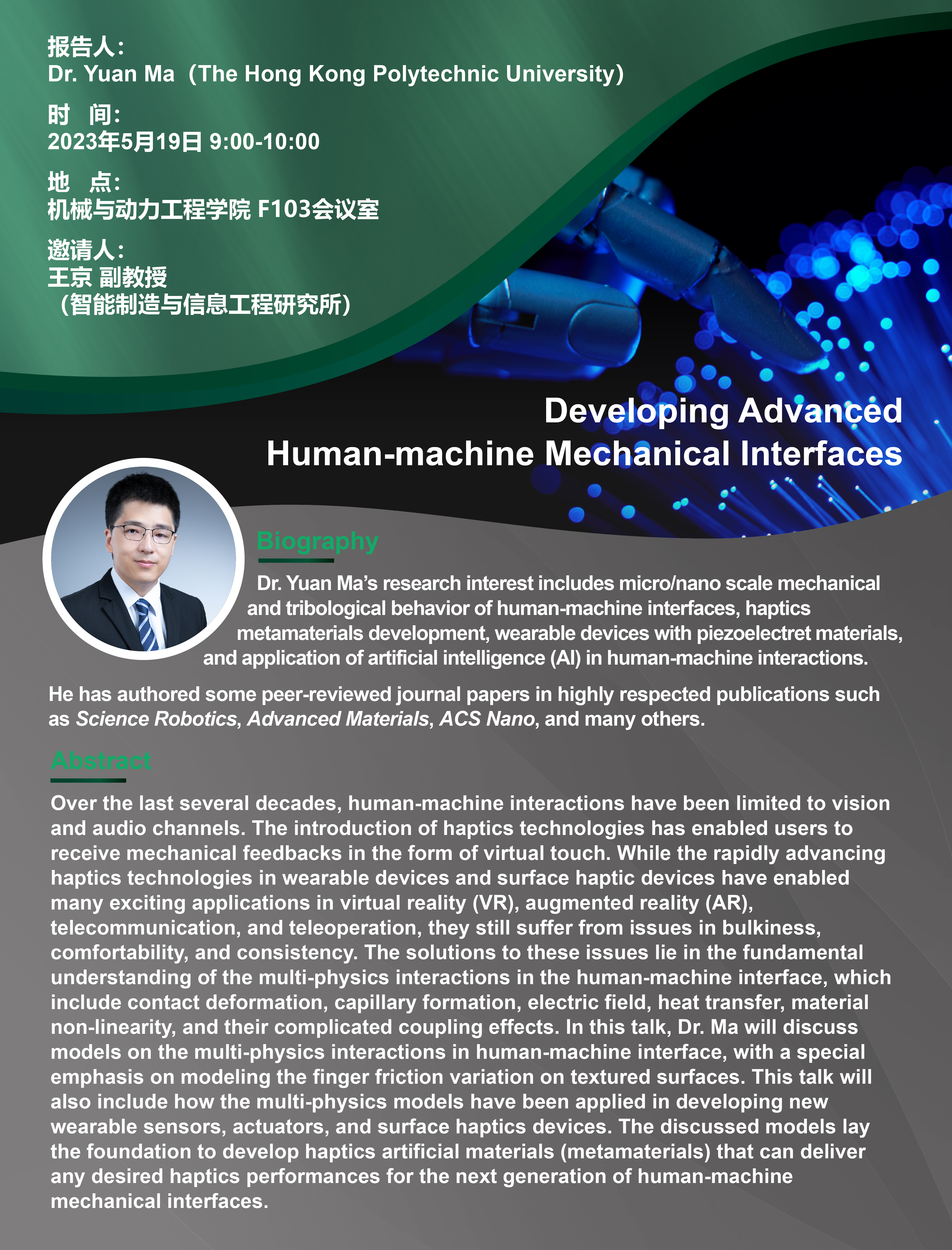 Over the last several decades, human-machine interactions have been limited to vision and audio channels. The introduction of haptics technologies has enabled users to receive mechanical feedbacks in the form of virtual touch. While the rapidly advancing haptics technologies in wearable devices and surface haptic devices have enabled many exciting applications in virtual reality (VR), augmented reality (AR), telecommunication, and teleoperation, they still suffer from issues in bulkiness, comfortability, and consistency. The solutions to these issues lie in the fundamental understanding of the multi-physics interactions in the human-machine interface, which include contact deformation, capillary formation, electric field, heat transfer, material non-linearity, and their complicated coupling effects. In this talk, Dr. Ma will discuss models on the multi-physics interactions in human-machine interface, with a special emphasis on modeling the finger friction variation on textured surfaces. This talk will also include how the multi-physics models have been applied in developing new wearable sensors, actuators, and surface haptics devices. The discussed models lay the foundation to develop haptics artificial materials (metamaterials) that can deliver any desired haptics performances for the next generation of human-machine mechanical interfaces.