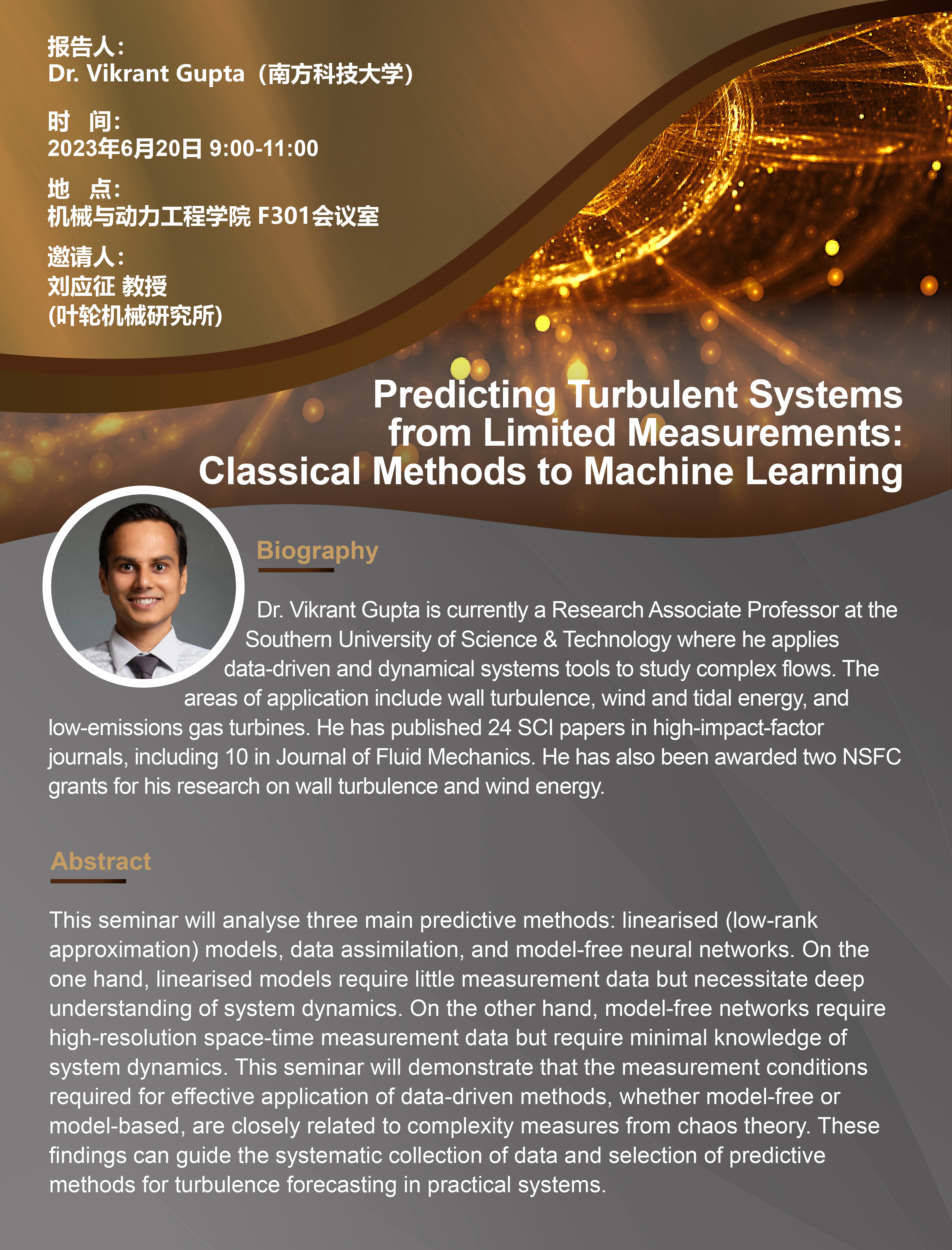 This seminar will analyse three main predictive methods: linearised (low-rank approximation) models, data assimilation, and model-free neural networks. On the one hand, linearised models require little measurement data but necessitate deep understanding of system dynamics. On the other hand, model-free networks require high-resolution space-time measurement data but require minimal knowledge of system dynamics. This seminar will demonstrate that the measurement conditions required for effective application of data-driven methods, whether model-free or model-based, are closely related to complexity measures from chaos theory. These findings can guide the systematic collection of data and selection of predictive methods for turbulence forecasting in practical systems.