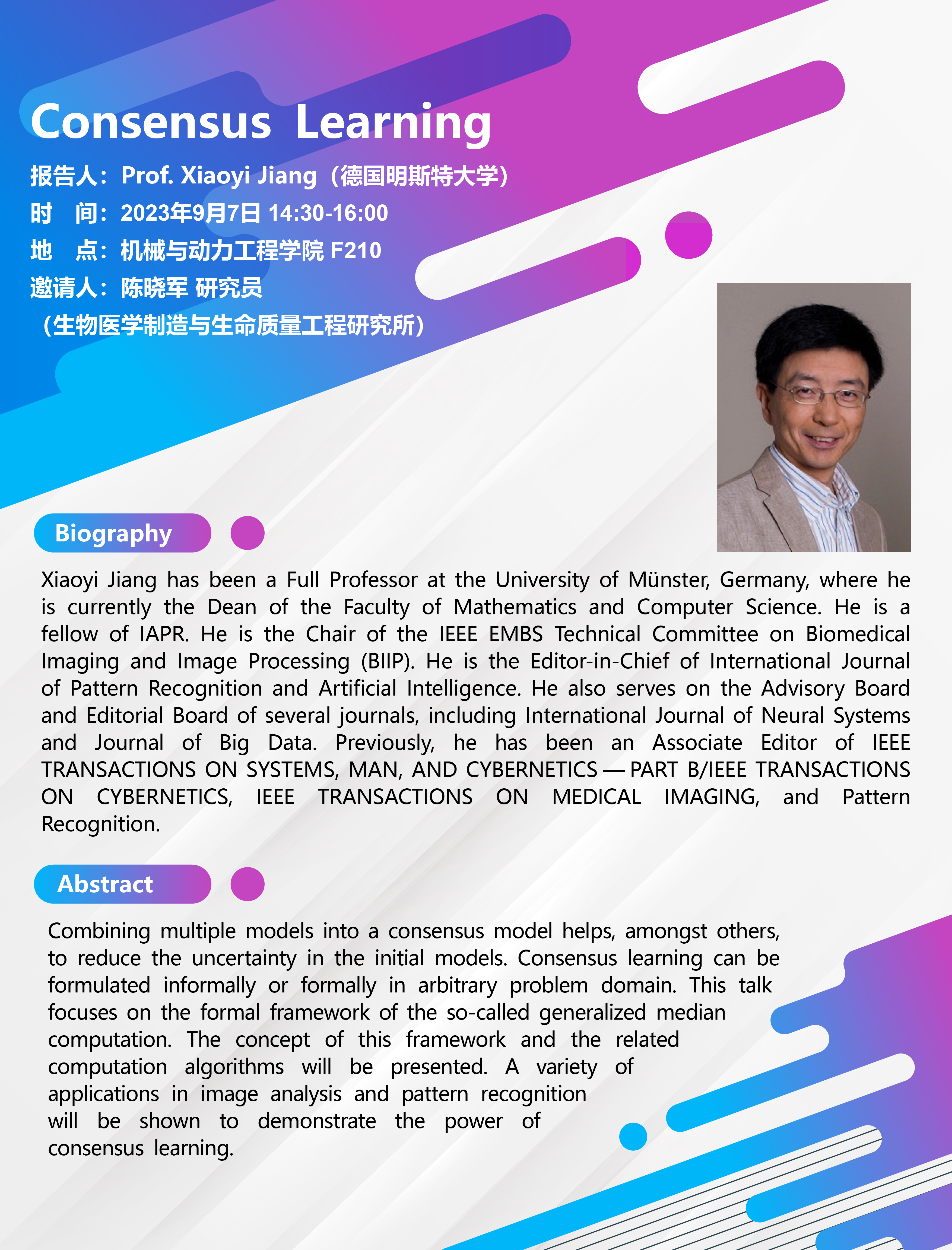 Xiaoyi Jiang has been a Full Professor at the University of Münster, Germany, where he is currently