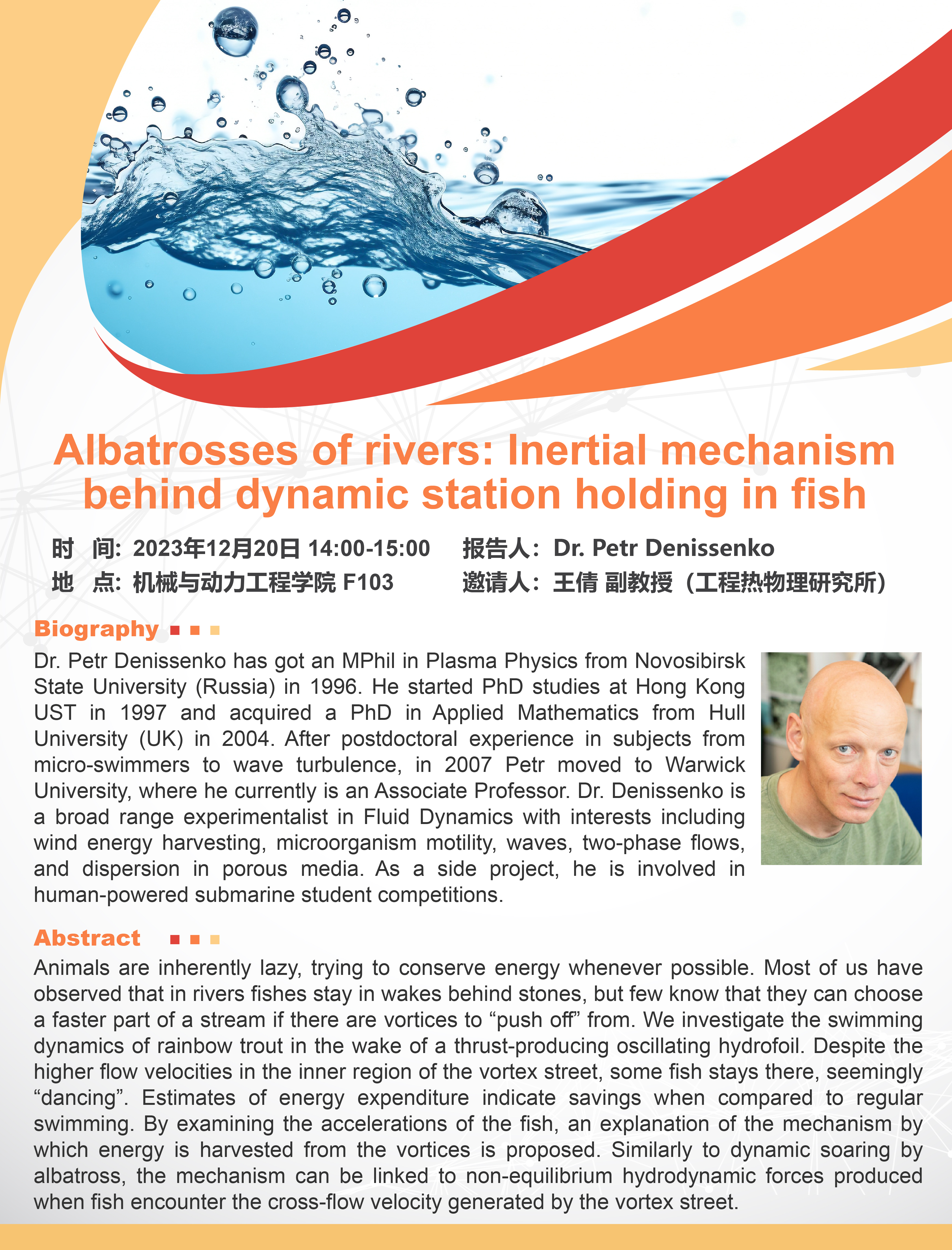 He started PhD studies at Hong Kong UST in 1997 and acquired a PhD in Applied Mathematics from Hull University (UK) in 2004. After postdoctoral experience in subjects from micro-swimmers to wave turbulence, in 2007 Petr moved to Warwick University, where he currently is an Associate Professor. Dr. Denissenko is a broad range experimentalist in Fluid Dynamics with interests including wind energy harvesting, microorganism motility, waves, two-phase flows, and dispersion in porous media. As a side project, he is involved in human-powered submarine student competitions.