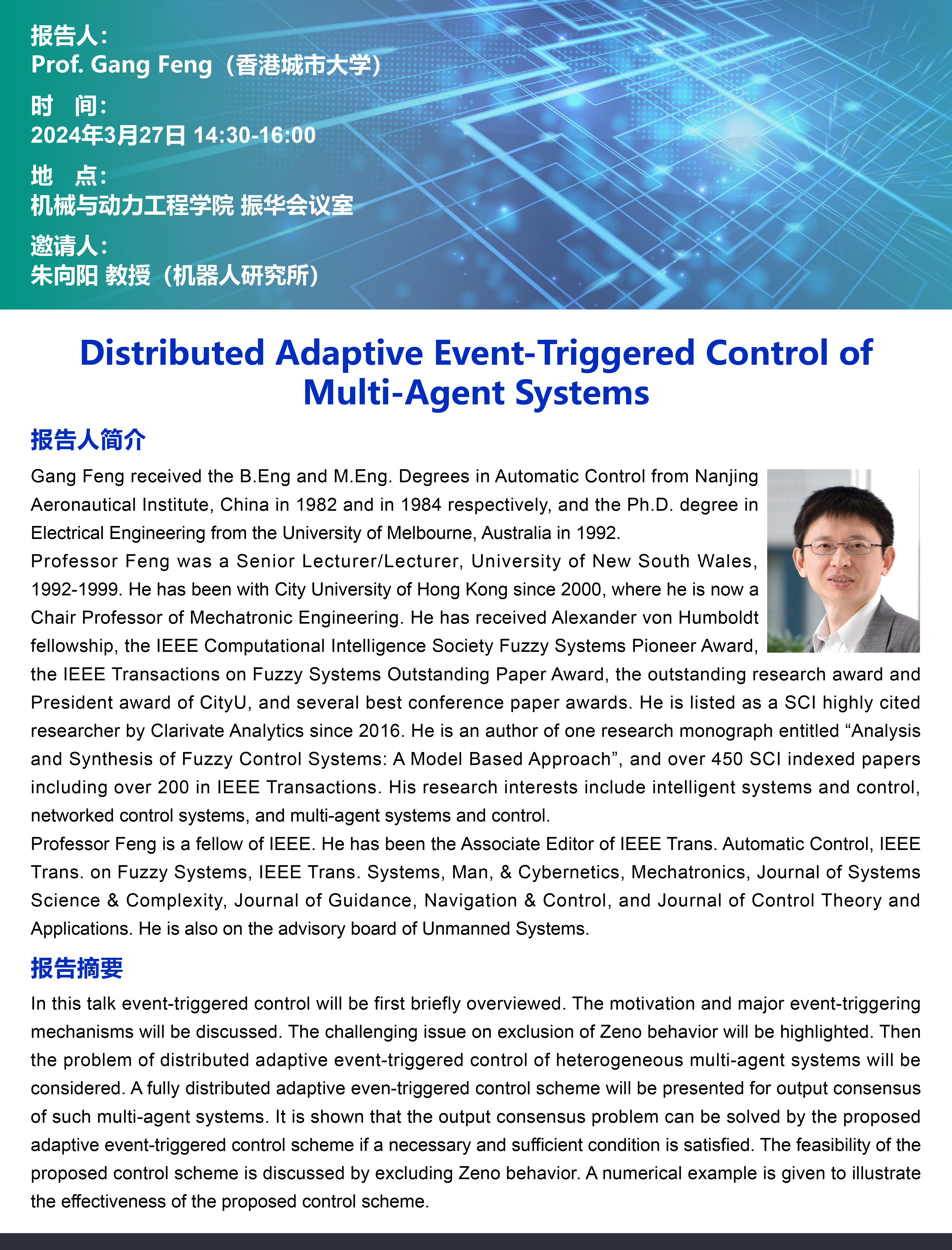 Professor Feng is a fellow of IEEE. He has been the Associate Editor of IEEE Trans. Automatic Control, IEEE Trans. on Fuzzy Systems, IEEE Trans. Systems, Man, & Cybernetics, Mechatronics, Journal of Systems Science & Complexity, Journal of Guidance, Navigation & Control, and Journal of Control Theory and Applications. He is also on the advisory board of Unmanned Systems.