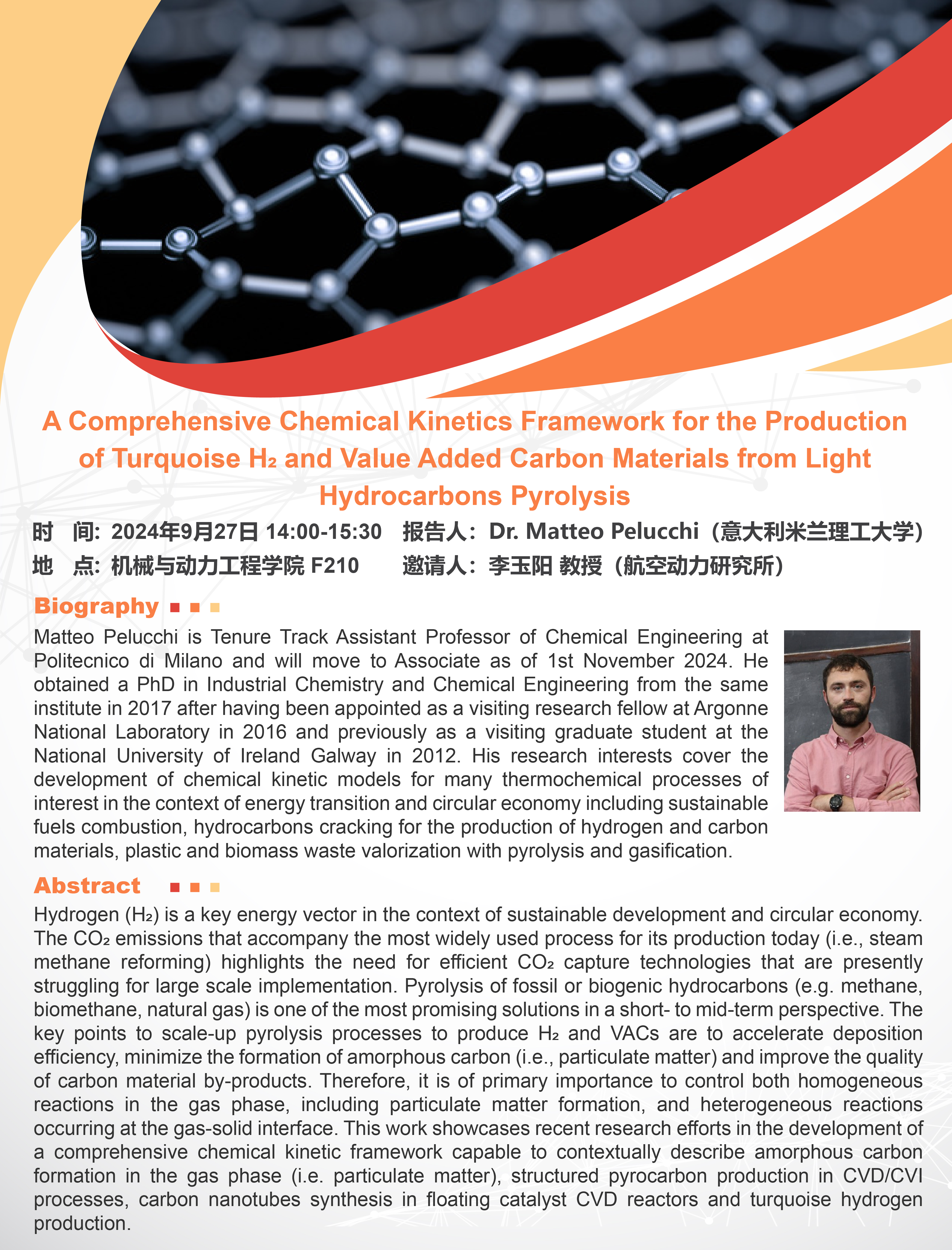 Matteo Pelucchi is Tenure Track Assistant Professor of Chemical Engineering at Politecnico di Milano and will move to Associate as of 1st November 2024. He obtained a PhD in Industrial Chemistry and Chemical Engineering from the same institute in 2017 after having been appointed as a visiting research fellow at Argonne National Laboratory in 2016 and previously as a visiting graduate student at the National University of Ireland Galway in 2012. His research interests cover the development of chemical kinetic models for many thermochemical processes of interest in the context of energy transition and circular economy including sustainable fuels combustion, hydrocarbons cracking for the production of hydrogen and carbon materials, plastic and biomass waste valorization with pyrolysis and gasification.
