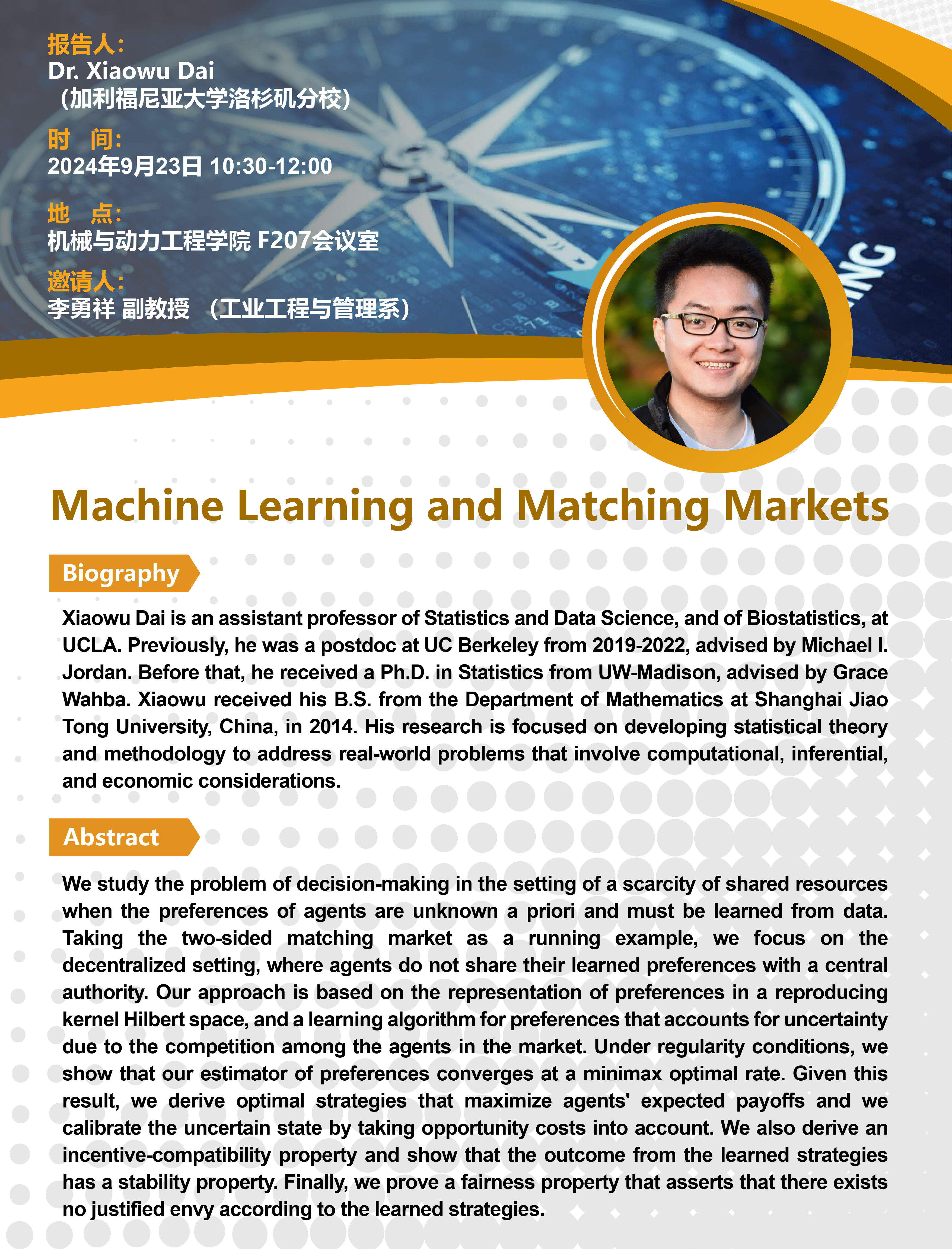 Xiaowu Dai is an assistant professor of Statistics and Data Science, and of Biostatistics, at UCLA. Previously, he was a postdoc at UC Berkeley from 2019-2022, advised by Michael I. Jordan. Before that, he received a Ph.D. in Statistics from UW-Madison, advised by Grace Wahba. Xiaowu received his B.S. from the Department of Mathematics at Shanghai Jiao Tong University, China, in 2014. His research is focused on developing statistical theory and methodology to address real-world problems that involve computational, inferential, and economic considerations.