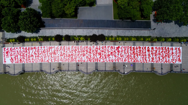 It took more than 4 hours, a giant brush and special red ink for Prof. Xu to complete the creation on a special writing cloth. This cursive writing reaches 10 meters in height and 100 meters in length. The 4 poems written are meticulously chosen to lead us through the extraordinary years of the past and pay tribute to the achievements of the new era, which arouses the aspirations in us to embrace a better future with full confidence.