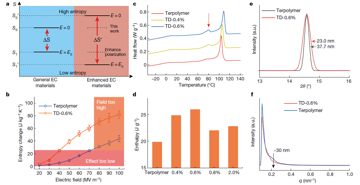 On December 23, 2021, the interdisciplinary research team lead by Prof. Xiaoshi Qian from School of Mechanical Engineering at Shanghai Jiao Tong University published the research article, "High-entropy polymer produces giant electric heating effect in low field", in Nature. A high-entropy polymer material was designed in this work through the ingenious design of molecular defects in relaxor ferroelectric materials, which can greatly improve the giant electrocaloric at low electric filed. For the first time, the cycle life of the giant electrocaloric cooling effect was increased to millions of times. It should be noted that it is the first time that a Chinese scientific research unit published a paper about electrocaloric materials in Nature. Moreover, it is the first time that the School of Mechanical Engineering from Shanghai Jiao Tong University published a research paper on Nature as the first unit.