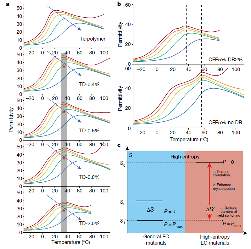 The dielectric properties suggest that the terpolymer modified by reducing a small amount of CFE groups to DBs possesses (i) a much higher dipolar entropy and (ii) much lower barriers for the field-induced transition than that of the base terpolymer, which results in a giant ECE at low electric fields.