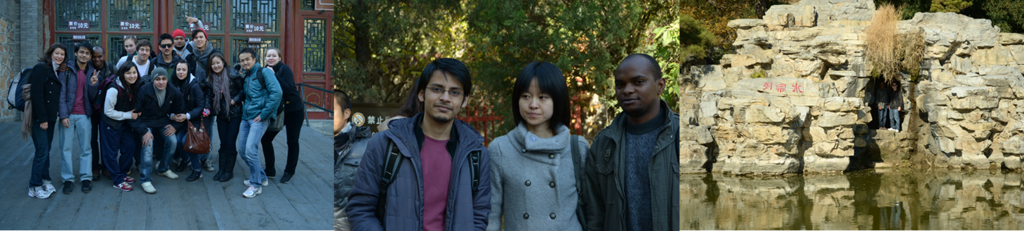 Figure 1. From left to right: With other foreign students for mandarin chinese class; with an Indian friend (left) and mandarin chinese teacher (middle); on a trip organized by BLCU to the mountains