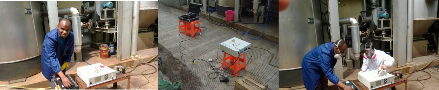 Figure 2. From left to right: Preparing a field study on Nitrogen Oxides (NOx) produced from biomass gasification system at Songjiang; set-up ready for testing flue gases emitted; my research group colleague and myself collecting and recording raw data of emissions via NOx analyzer and Gasboard Analyzer.