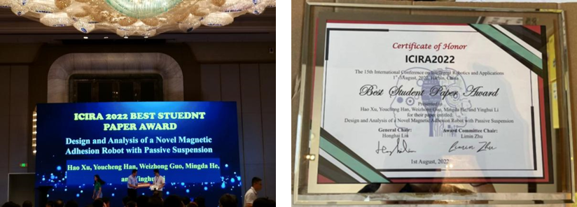 The 15th International Conference on Intelligent Robotics and Applications (ICIRA 2022) was held in Harbin from August 1 to 3. Master student Mr. Hao Xu from Institute of Design and Control Engineering for Heavy Equipment at School of Mechanical Engineering, Shanghai Jiao Tong University guided by Professor Weizhong Guo, made an oral presentation entitled“Design and Analysis of a Novel Magnetic Adhesion Robot with Passive Suspension”and won the Best Student Paper Award.