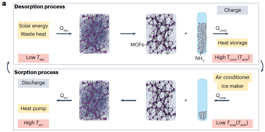 Given the energy crisis and the increasing frequency of climate extremes, efficient heating and cooling technologies that do not rely on fossil fuels are urgently needed. The thermal-driven sorption refrigeration and thermal energy storage technology represent promising alternatives as they don’t necessitate the consumption of high-grade electrical energy, and the crux of this technology lies in the working pair composed of a sorbent and a sorbate. Ammonia as an environmentally friendly working fluid, features a wide temperature range, large latent heat of vaporization, etc., making it a potential sorbate of considerable interest. MOF-ammonia working pairs exhibit excellent temperature adaptability in extreme climates due to their controllable sorption potential and tunable host-guest interaction strength.
