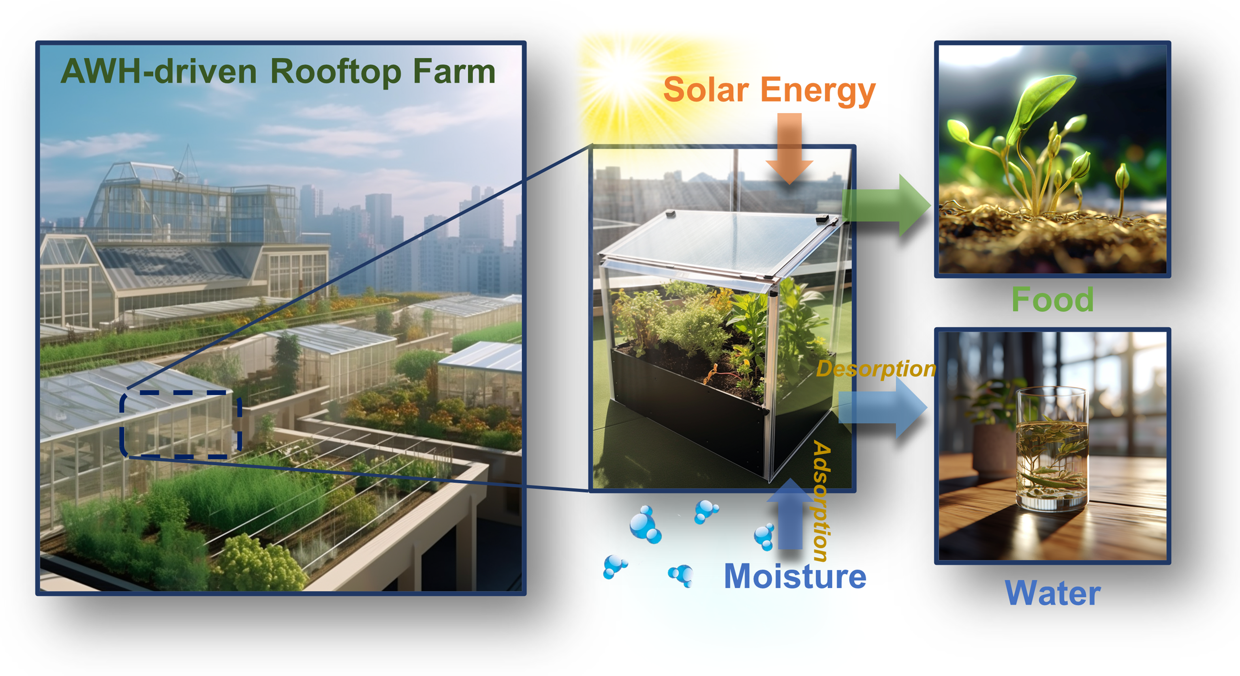 Combining atmospheric water harvesting technology with rooftop agriculture provides unprecedented opportunities for sustainable urban development. Beyond the apparent benefits of water and food production, this technology can also integrate with unique features of existing buildings. Utilizing waste heat from building HVAC systems as the energy for desorption recycles wasted resources, avoids negative impacts on plant growth, maximizes thermal energy utilization, and regulates indoor temperature and humidity. Additionally, rooftop farms reduce buildings' thermal load and energy consumption by providing shade and transpiration, mitigating the impact of urban heat islands on local climate and environment. Ultimately, this localized method of sustainable water and food acquisition eliminates the need for long-distance transportation, further revolutionizing our understanding of water and food production in urban sustainability, and taking a crucial step towards sustainable urban development at the nexus of energy, water, and food, addressing global food security and supply challenges.