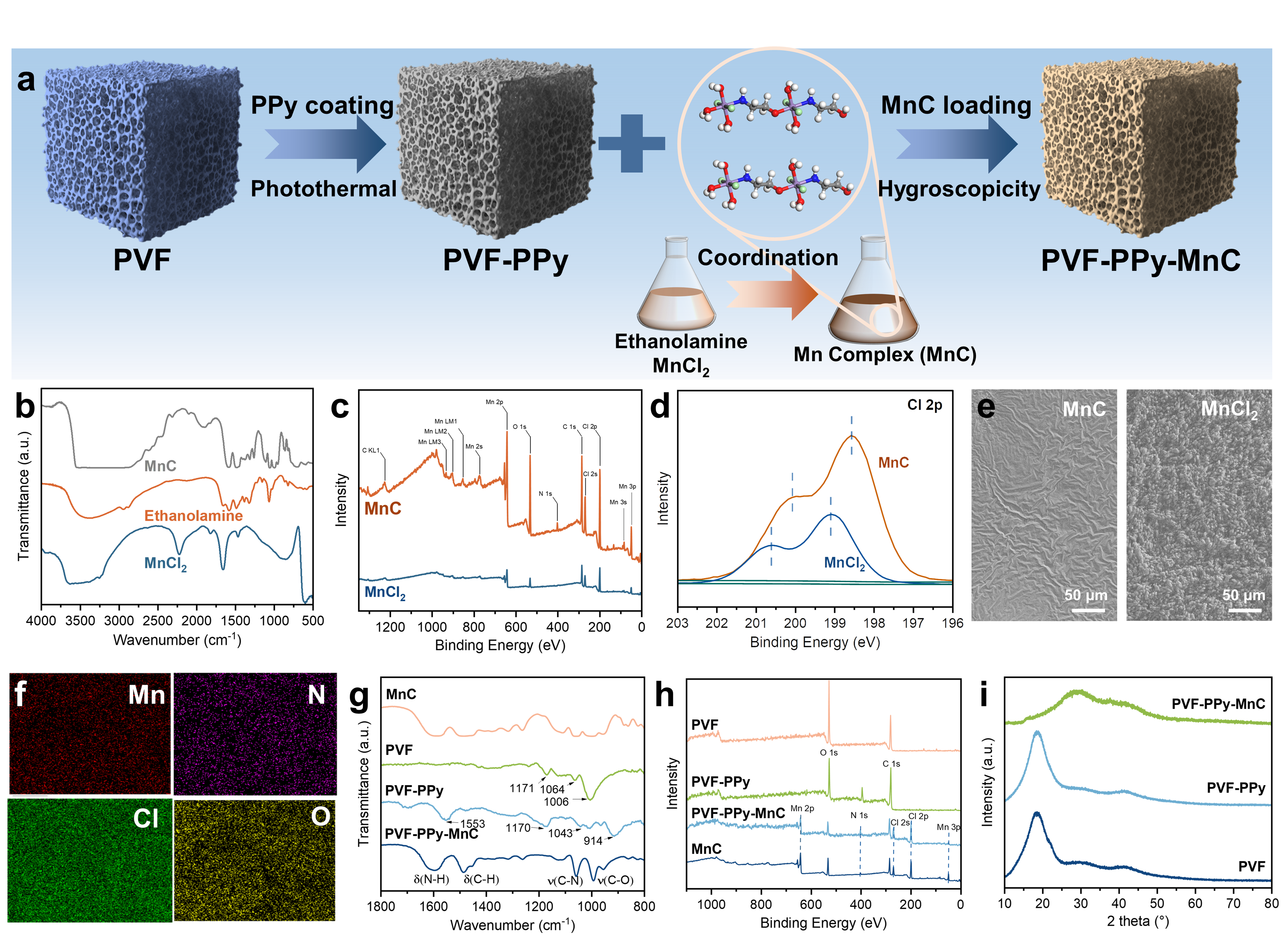 Focusing on large-scale, low-cost preparation and fast kinetics under moderate to high humidity conditions, the research team developed an adsorption material composed of a manganese (II)-ethanolamine complex hygroscopic coordination compound and a porous polyvinyl alcohol aldehyde foam matrix. The final composite material achieved an adsorption capacity of 0.45-2.54 g g-1 at 50-90% relative humidity and a significant increase in water adsorption capacity suitable for regions with large diurnal temperature variations or constantly moderate-to-high humidity. The kinetics of the material adsorption reached 0.0235 g/g/min, with adsorption equilibrium achievable within 240 minutes, suitable for multiple adsorption-desorption cycles. The team also explored the device-level scaled-up material in various conditions including standalone photothermal desorption, spatial heating desorption, and combined waste heat-solar energy interface desorption, providing design assurances for stable performance in complex outdoor climates.
