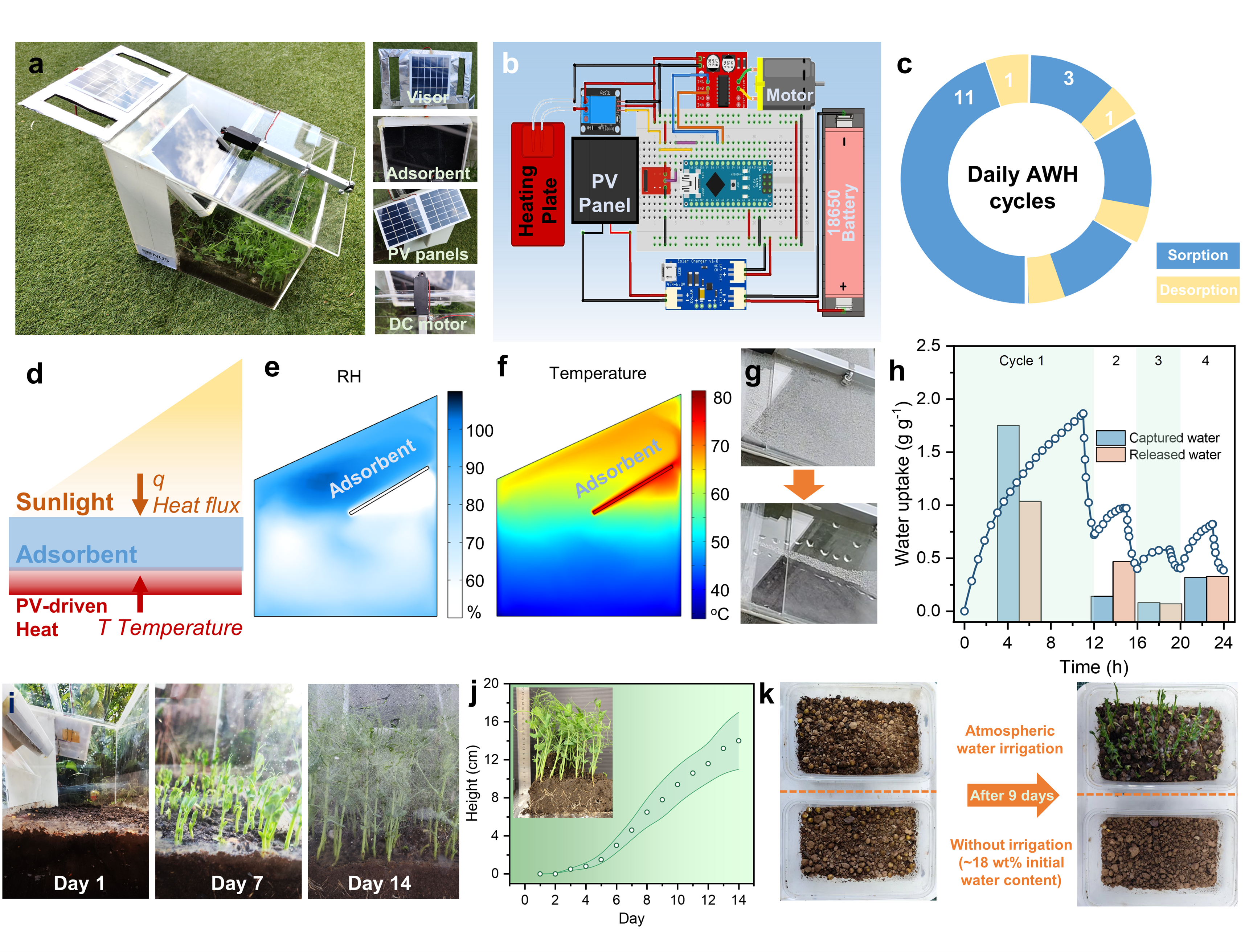 To advance the practical implementation of integrated atmospheric water harvesting and rooftop agriculture, Prof. Wang's team collaborated with Prof. Swee Ching Tan to optimize the material dynamics, deployment climatic characteristics, and plant growth traits, leading to the creation of a fully automated atmospheric water source irrigation rooftop farm. Without external water input, this system achieved a water yield of 879.9 g/m² and a food production rate of 1.28 kg/m² over 14 days, offering a new pathway for distributed harvests of food and water in cities and sustainable urban development.