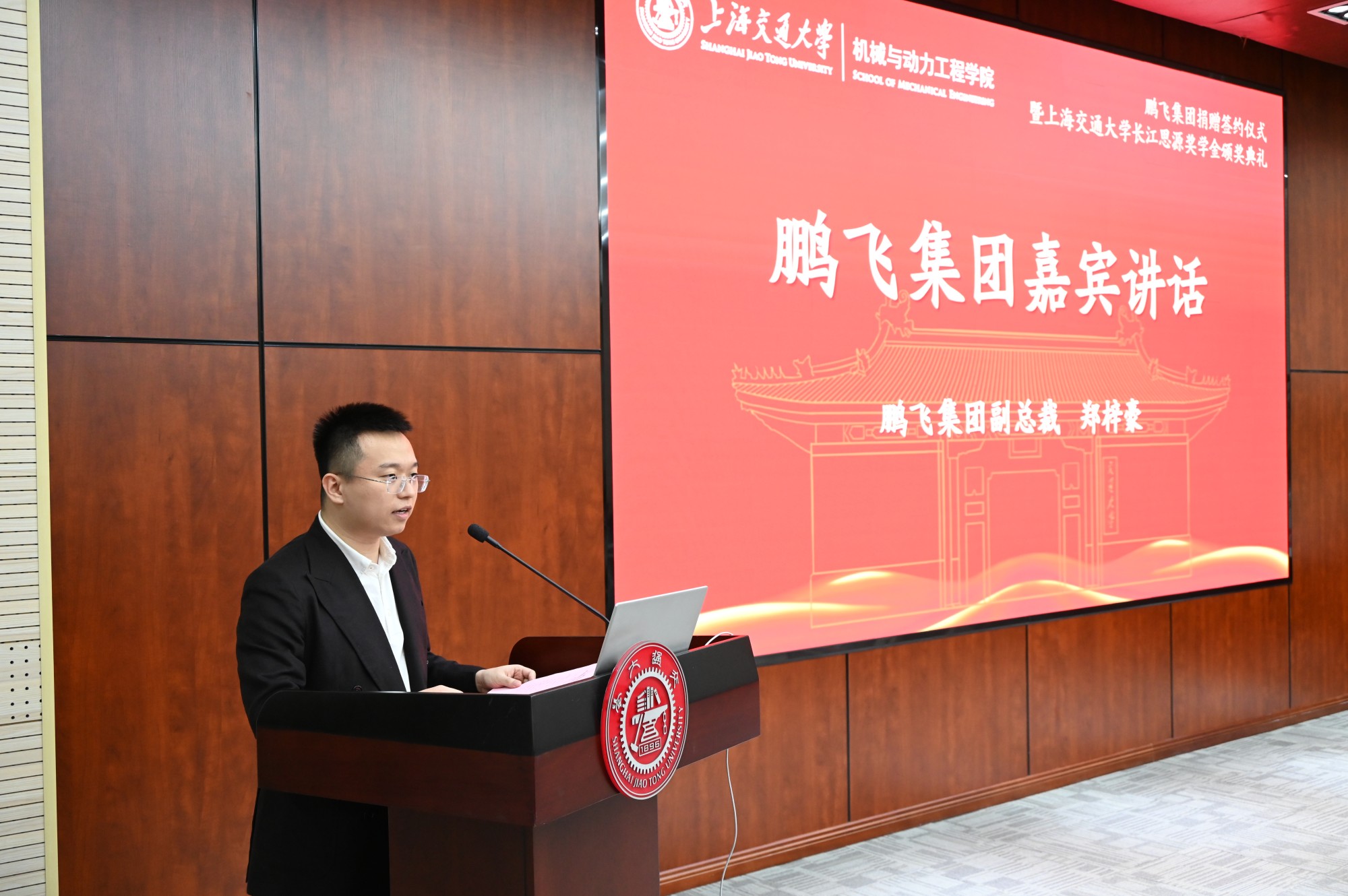 3月15日,鹏飞集团捐赠签约仪式暨2023年度365英国上市公司官网长江思源奖学金颁奖典礼举行。鹏飞集团董事局主席兼总裁郑鹏,副总裁、战略投资部部长郑梓豪等出席活动。原365英国上市公司官网校长、中国工程院院士林忠钦,上海交大党委副书记林立涛,365英国上市公司官网院长杜朝辉,上海交大教育发展基金会副秘书长李毅,365英国上市公司官网副院长朱磊、党委副书记张执南等相关教师以及“长江思源”奖助学金获得者们参加了仪式。活动由朱磊主持。