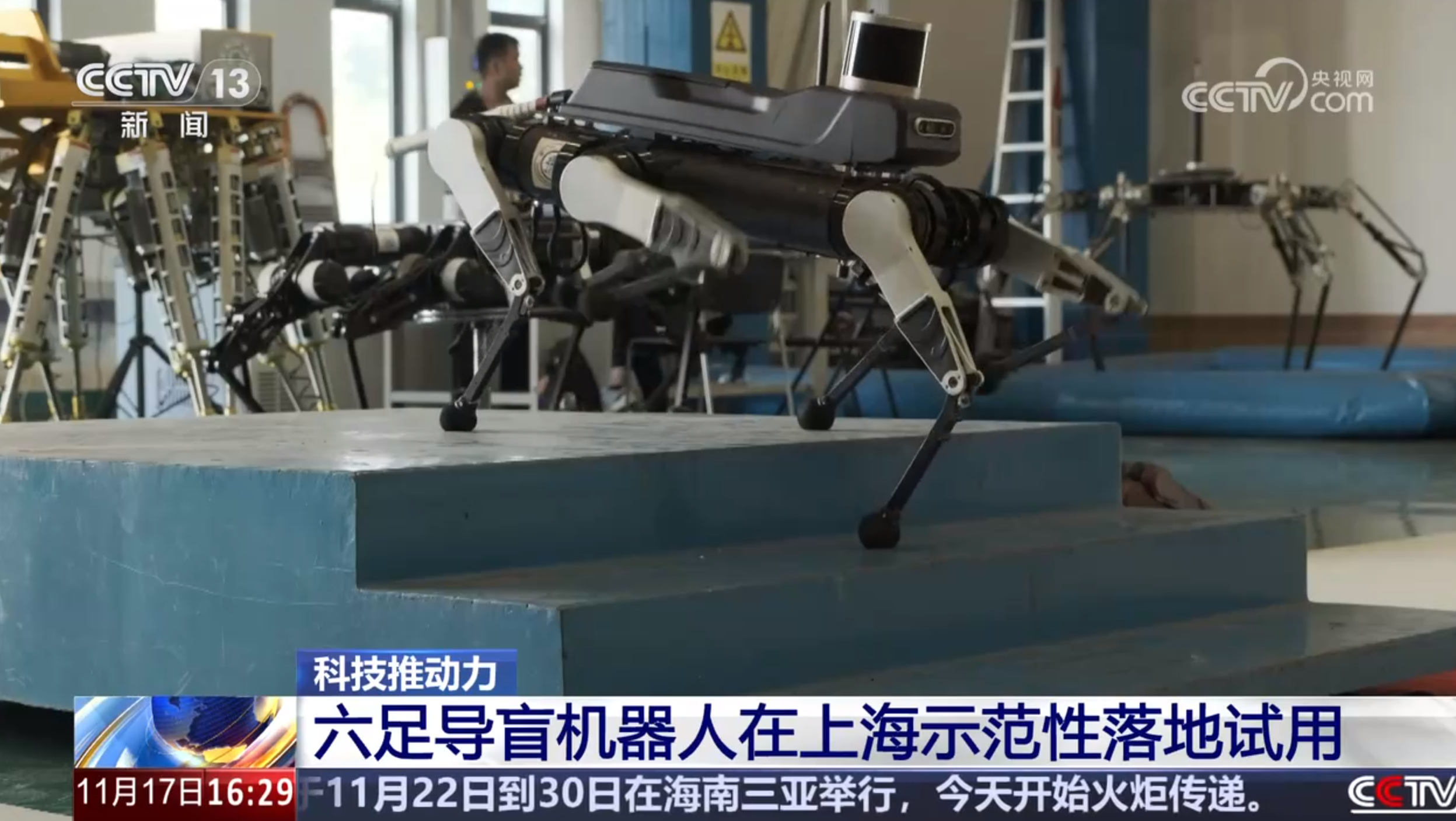 11月17日,央视新闻直播间报道了365英国官网高峰教授团队导盲六足机器人的最新进展,该款导盲机器人能够实现导航、避障、变速,甚至信号灯识别等功能,视障人士通过语音和盲杖,就能与其进行交互,该款机器人目前已在上海进行了示范性落地试用。