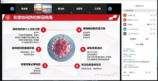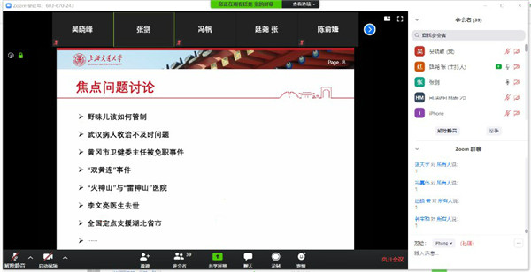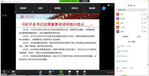 接着,张廷尧号召大家进行疫情相关的焦点问题讨论活动,并介绍了建言献策中征集到的各类意见与建议。吴晓峰为大家介绍了“同读一本书”活动,希望大家坚持在微信小程序打卡,两周读完一本书。在焦点问题的讨论环节,大家踊跃发言。安琪、陈钧、冯帆等同学表示,在当前防疫关键时刻,一是做好自己的防护工作,二是响应国家号召,呆在家中,减少防疫工作人员的工作量,为社会做贡献。