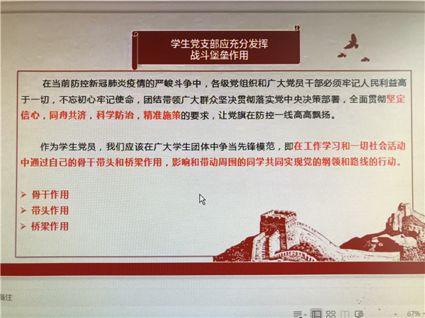 3月25日,知识工程所研究生党支部以“战疫”当前——做新时代硬核学生党员和“以梦为马,不负韶华”毕业生远航教育为主题开展了专题组织生活会。会议由党支部书记刘玮洁主持,知识工程所教工党支部戚进老师、学生党支部指导教师陶晓红及支部成员参加会议。