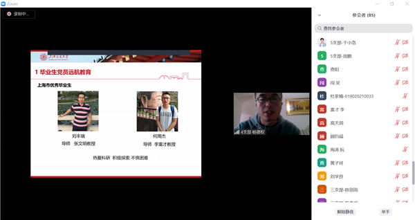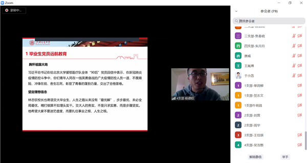 最后,主持人讲解了疫情防控期间大家应该注意的事项。例如全体学生务必不要提前返校、留校学生因特殊情况外出需提前报备并审批、入境或者来沪同学需提前三天申请报备并审批等。主持人号召学生党员带头做好疫情防控工作,积极引领班风和学风,保障线上教学科研顺利进行。