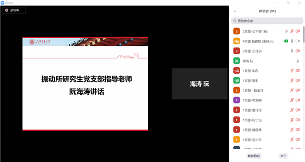 接着,支部指导老师阮海涛向大家介绍了交大同学在这次疫情中所做的努力,让我们感受到交大人勇担责任的胸怀。在谈到这次疫情时,他希望同学们继续在家保持良好的科研学习状态,注意身体健康,做好疫情防护工作。他介绍了振动所一些优秀毕业生的去向,希望同学之间相互学习,多多交流,共同进步。